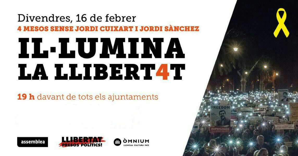 Concentracions avui a les 7 de la tarda sota el lema 'Il·lumina la llibertat', per reclamar la llibertat dels presos, en motiu de la coincidència de la data d'avui amb el compliment dels 4 mesos de l'entrada a presó de Jordi Cuixart i Jordi Sànchez.