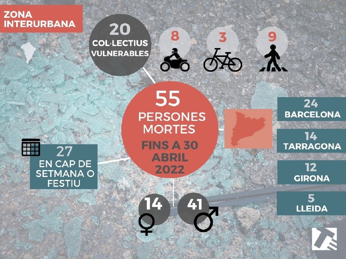 Les carreteres catalanes registren 55 morts de gener a abril, una més que el 2019. El quart mes de l'any ha estat el pitjor de l'any, amb el 42% de les víctimes del 2022. A la demarcació de Lleida han perdut la vida 5 persones