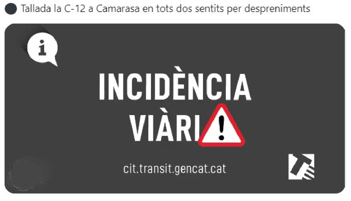 Un despreniment ha tallat aquest dimecres al matí en ambdós sentits la carretera C-12 al punt quilomètric 208-207 del terme de Camarasa, ubicat entre el municipi d'Àger i l'estació de trens i la cruïlla amb la carretera C-13