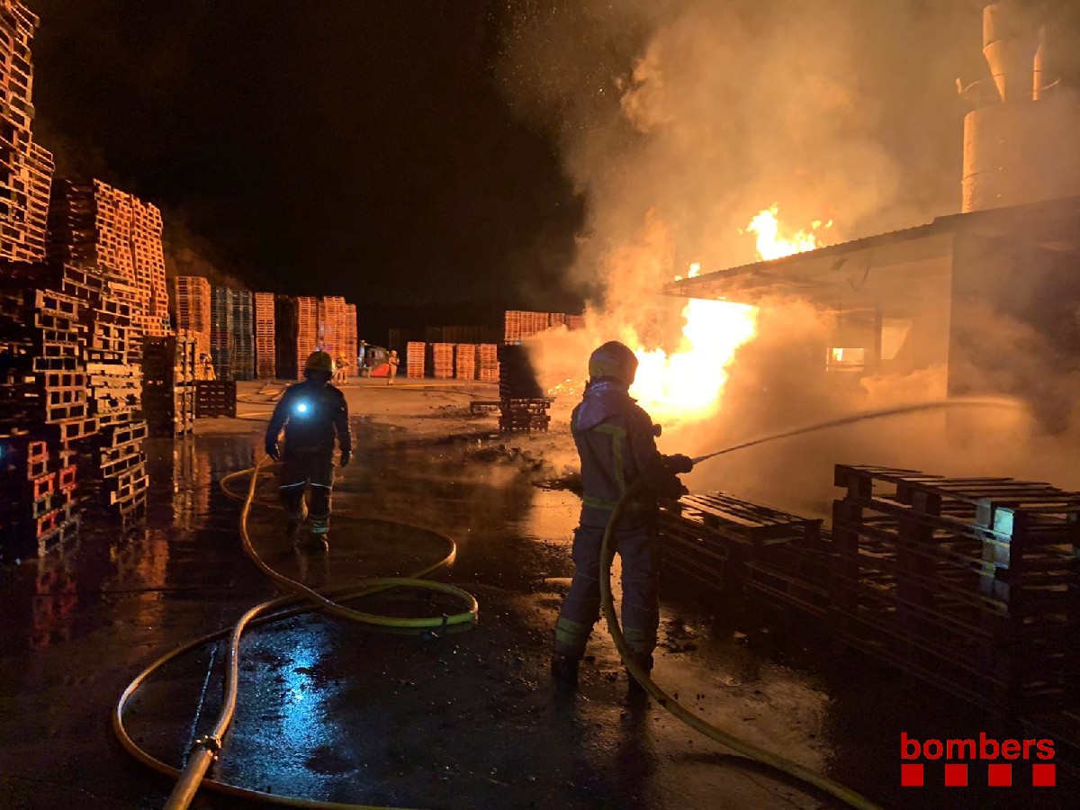 Els Bombers treballen en un incendi en una indústria de palets a Artesa de Segre. El foc ha quedat estabilitzat a les 2 de la matinada i vuit dotacions continuen fent tasques per extingir-lo