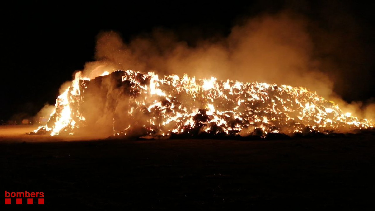 Els bombers treballen en l'extinció del foc en un paller a prop de la carretera C-12 a les afores de Balaguer. El foc crema des d'ahir al vespre i està controlat