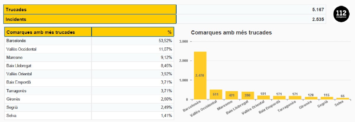 El 112 ha rebut 5.217 trucades fins a les vuit del matí per 2.566 incidents relacionats amb la revetlla. En la majoria de casos han estat serveis requerits per incendis a l'àrea metropolitana de Barcelona