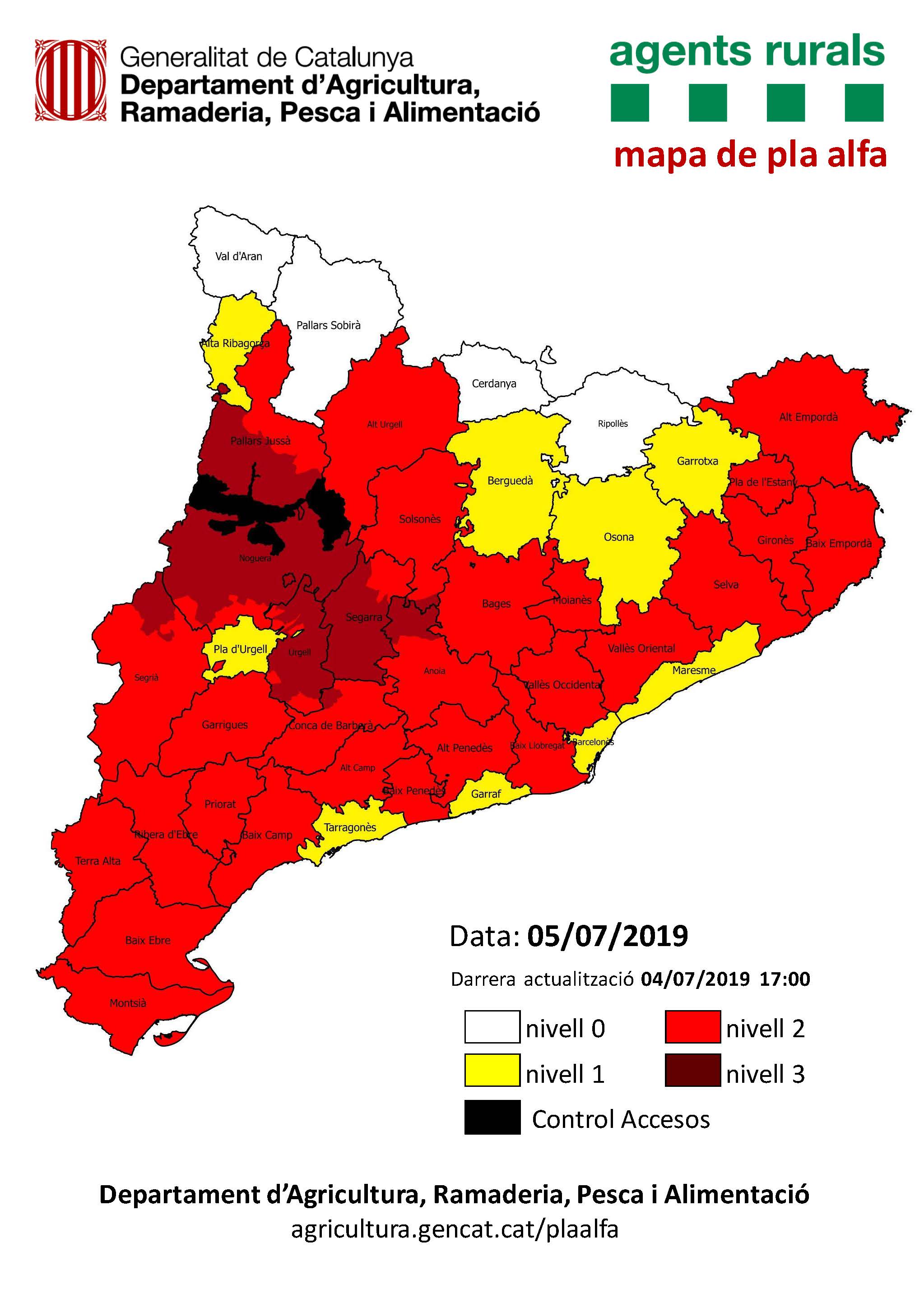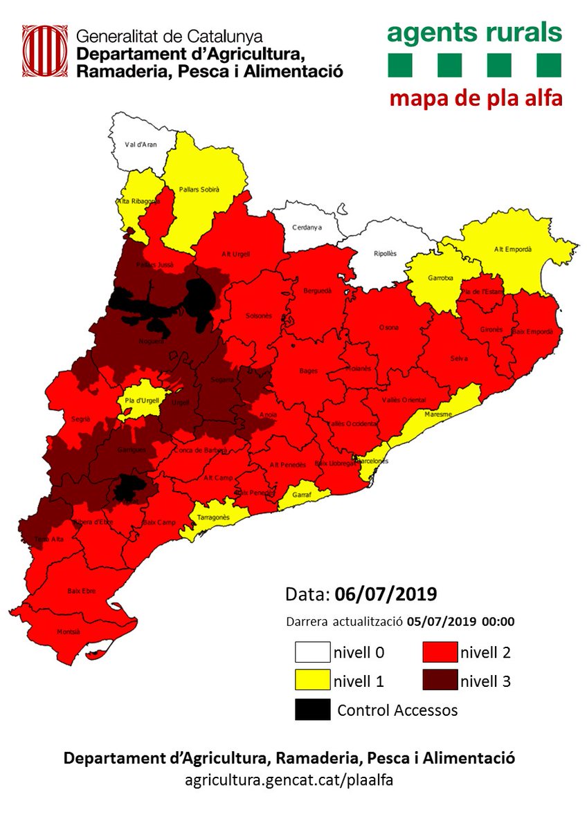 Agricultura alerta de l'alt risc d'incendi a partir d'aquest dimecres. Activa en 8 comarques el Nivell 3 del Pla Alfa i restringeix els accessos al massís del Montsec i de la Baronia de Rialb