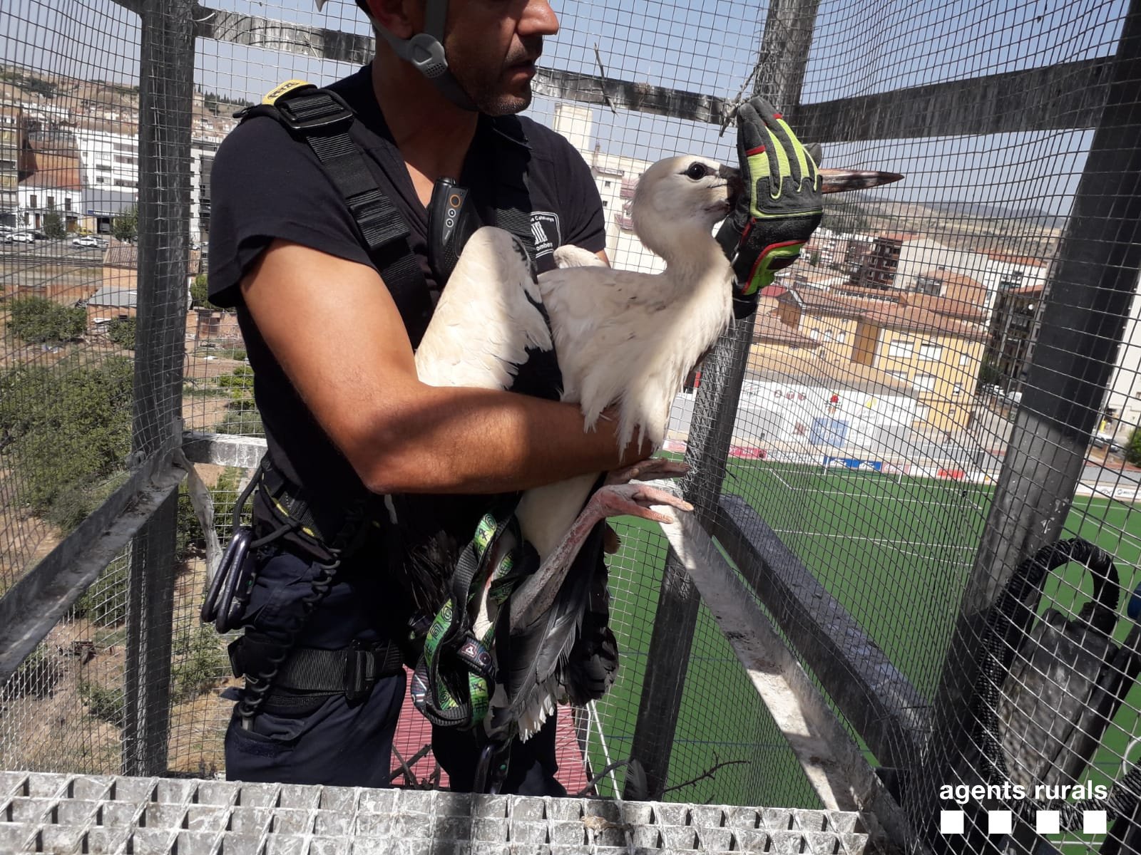 Una cigonya ha quedat atrapada a l'enllumenat del camp de futbol de Balaguer. Bombers i Agents Rurals l'han alliberat. Es tracta d'un cas que s'ha repetit fins a 7 vegades en els darrers dies.