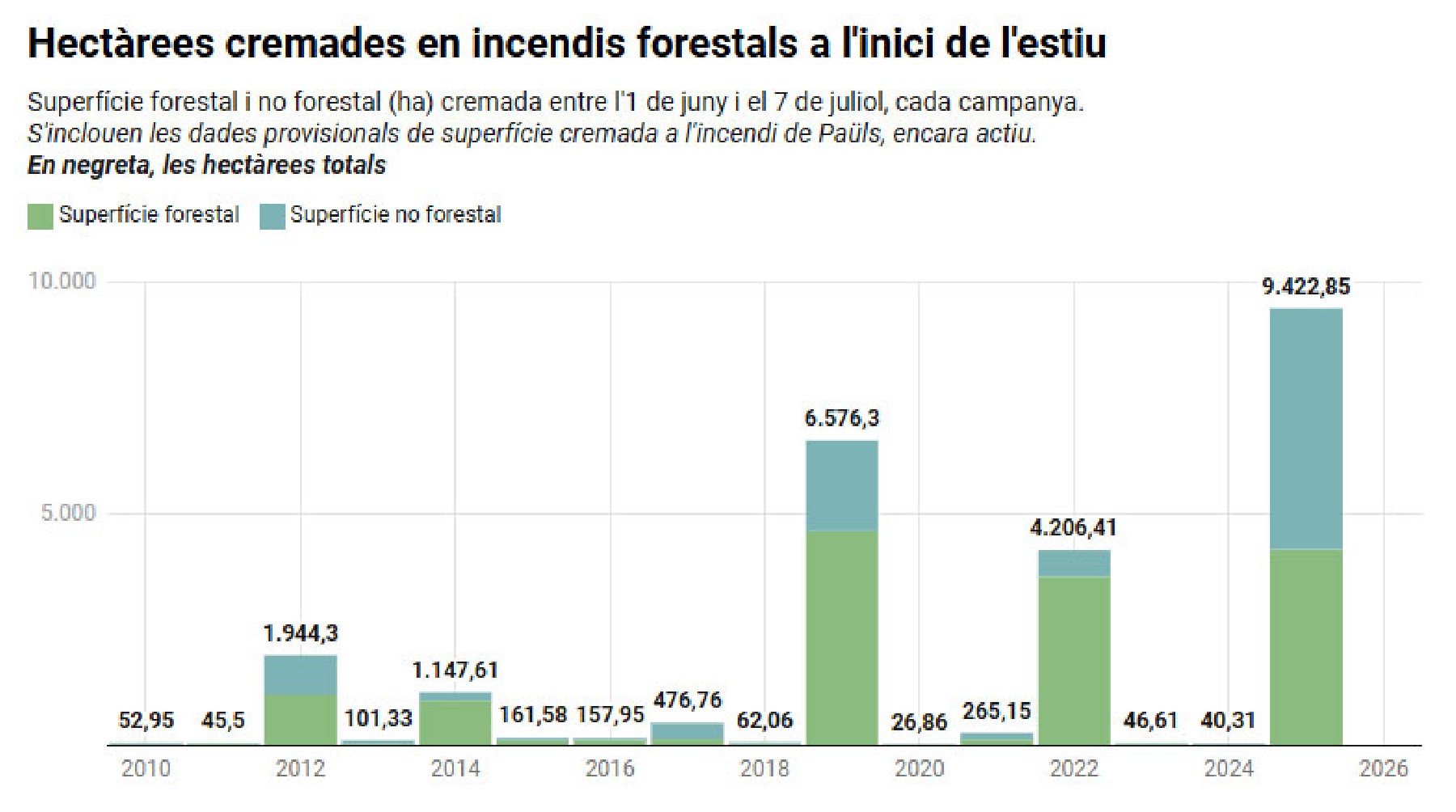 La superfície cremada en incendis aquest estiu ja supera qualsevol altra campanya dels últims 15 anys a aquestes alçades. Ja han cremat fins ara més de la meitat de les hectàrees afectades durant tot l'estiu del 2012, el més negre des dels 90