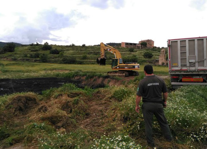Descobert un dipòsit irregular de fangs de depuradora que vessava per escorrentia cap a un torrent a Vilanova de l'Aguda. Els Agents Rurals han aconseguit fer una mota per evitar que arribi al medi aquàtic.
