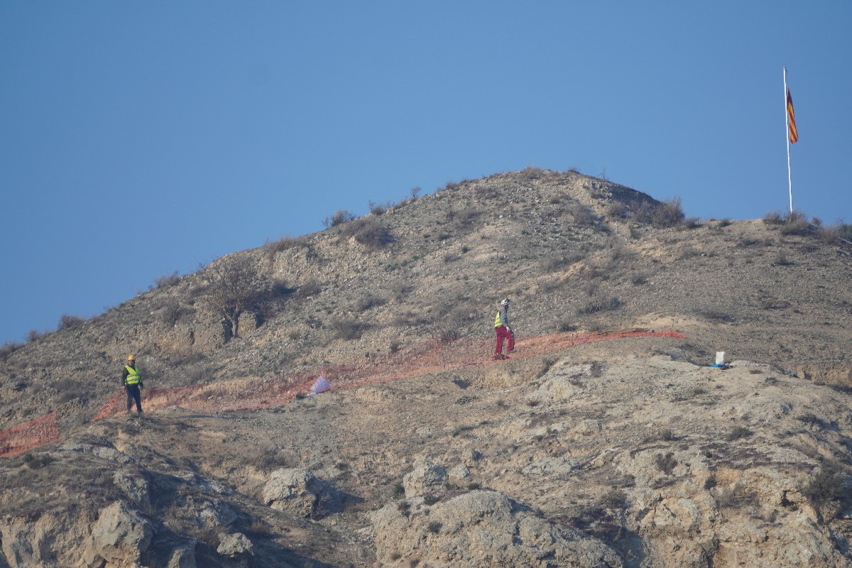 Aquest dimecres han començat les tasques per assegurar una de les roques de la penya Espígol de Gerb, que amenaça amb caure sobre algunes propietats, com magatzems i la carretera, que es troben a sota.