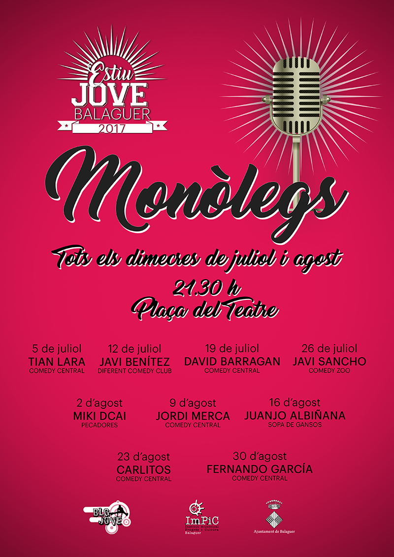 Continua avui el cicle de monòlegs a la plaça del Teatre de Balaguer. Aquesta nit, a partir de les 21.30h, és el torn del manxec Juanjo Albiñana, humorista professional, que oferirà alguns dels monòlegs emesos a la Comedy Central, al programa Sopa de Gansos i al Club de la Comedia.