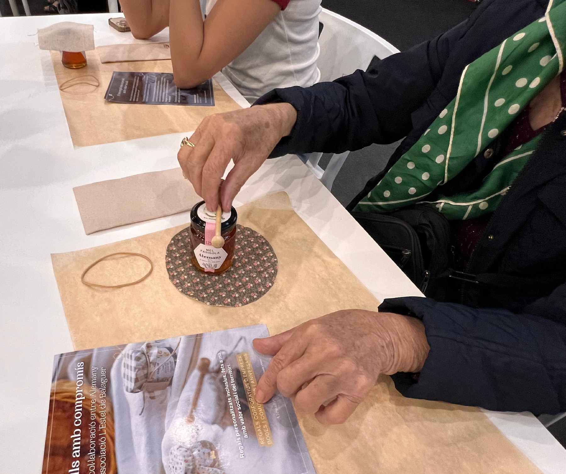La sessió ha començat amb una presentació a càrrec de Ferran Alemany, gerent de Torrons i Mel Alemany, i Maria Prat, directora del Taller Ocupacional de L'Estel, que han compartit l'origen, el recorregut i els valors que inspiren aquest projecte: inclusió, sostenibilitat, compromís i cooperació. També s'ha exposat una selecció de detalls ja elaborats, que han sorprès per la seva originalitat i pel valor afegit que incorporen. A continuació, s'ha dut a terme un taller pràctic on els assistents han pogut personalitzar el seu propi detall, acompanyats pel personal i les persones usuàries del taller. El resultat ha estat una experiència propera i enriquidora, en què la ciutadania ha pogut connectar amb el valor del treball manual, de l'atenció al detall i del compromís social.