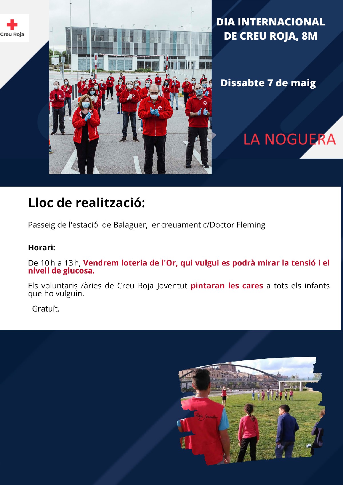 A Balaguer aquest dissabte dia 7 de maig, aprofitant la celebració del mercat setmanal, Creu Roja La Noguera realitzarà una activitat de visibilització, i instal·larà una parada de 10 a 1 al Passeig de l'estació, cruïlla amb el carrer Doctor Fleming: A la parada vendrà loteria del Sorteig D'or de Creu Roja. A més els voluntaris de Creu Roja Joventut pintaran cares. També el voluntariat de l'Equip de Socors i Emergències de Creu Roja realitzarà proves de glucosa en sang i mesurarà la tensió arterial.
