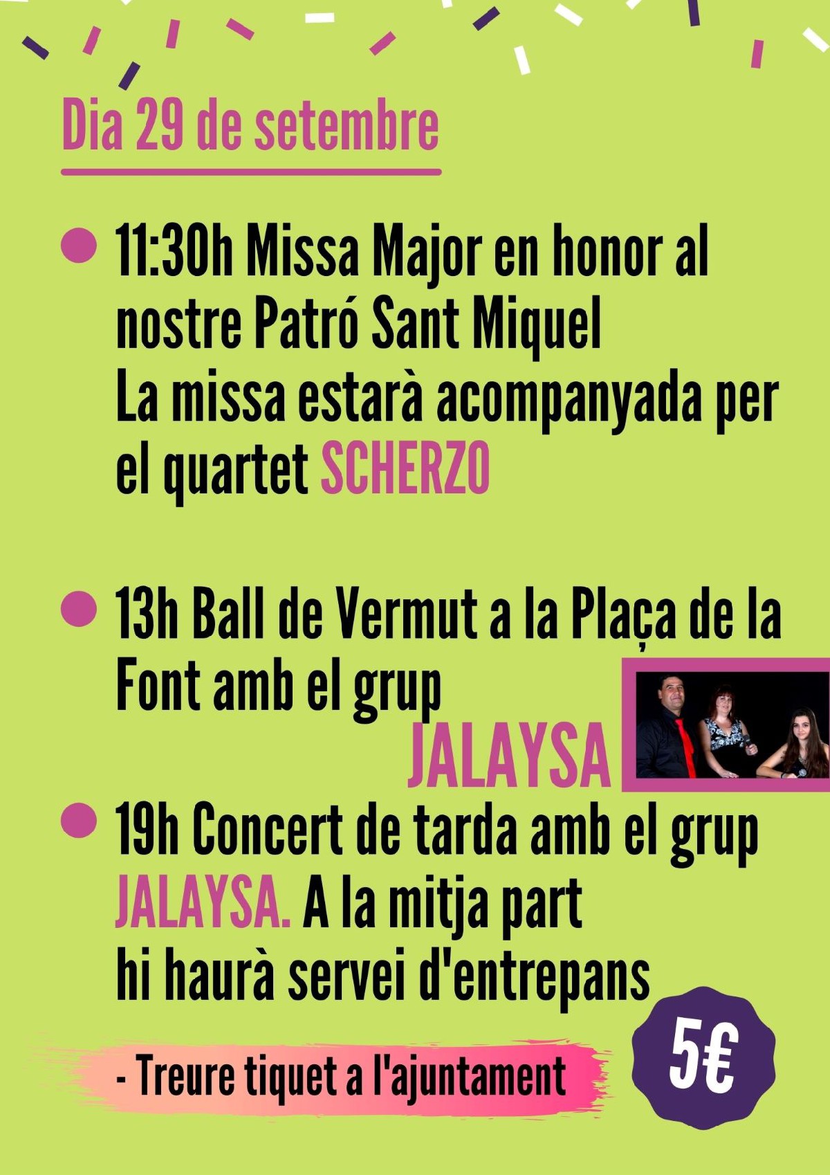 El dimecres dia 29 es farà un Ball Vermut i concert de tarda amb Jalaysa.
