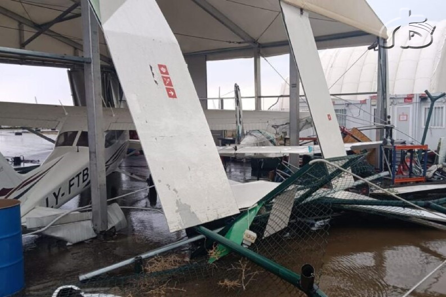 El director de l'aeroport de Lleida-Alguaire, Toni Serra, ha explicat que l'episodi de vent ha tombat un avió ultralleuger en una zona d'entre 200 i 300 metres on hi ha empreses que hi treballen. Altres dos avionets que estaven dins un hangar també han resultat malmesos per impactes d'objectes, i a l'exterior, 4 aparells, també de petites dimensions, han rebut cops. Els hanagars inflables que hi ha en aquesta zona han quedat trencats a la part on hi ha les portes d'accés i l'empresa que els gestiona ja ha començat a avaluar els danys. Una part de la tanca del recinte de l'aeroport també ha caigut i es mirarà de tornar a posar dempeus perquè la infraestructura pugui reprendre l'activitat dimecres al matí.