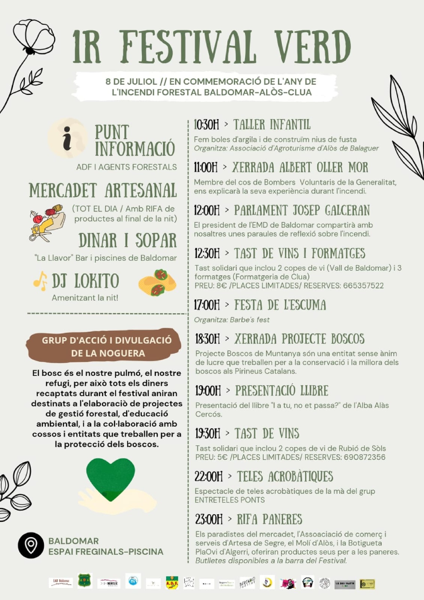 El 1r Festival Verd commemorarà el 8 de juliol el 1r any dels incendis forestals de Baldomar, Alòs i Clua. Consistirà en una jornada de propostes per conscienciar i recaptar fons per a la reforestació de la zona