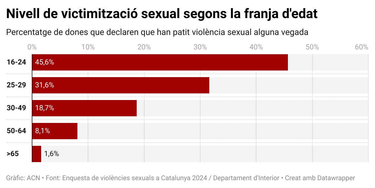 La franja d’edat més vulnerable és la de les joves d’entre 16 i 24 anys, de les quals un 45,6% ha reconegut haver patit violència sexual. La prevalença disminueix progressivament amb l’edat i es manté aquest patró en totes les tipologies.