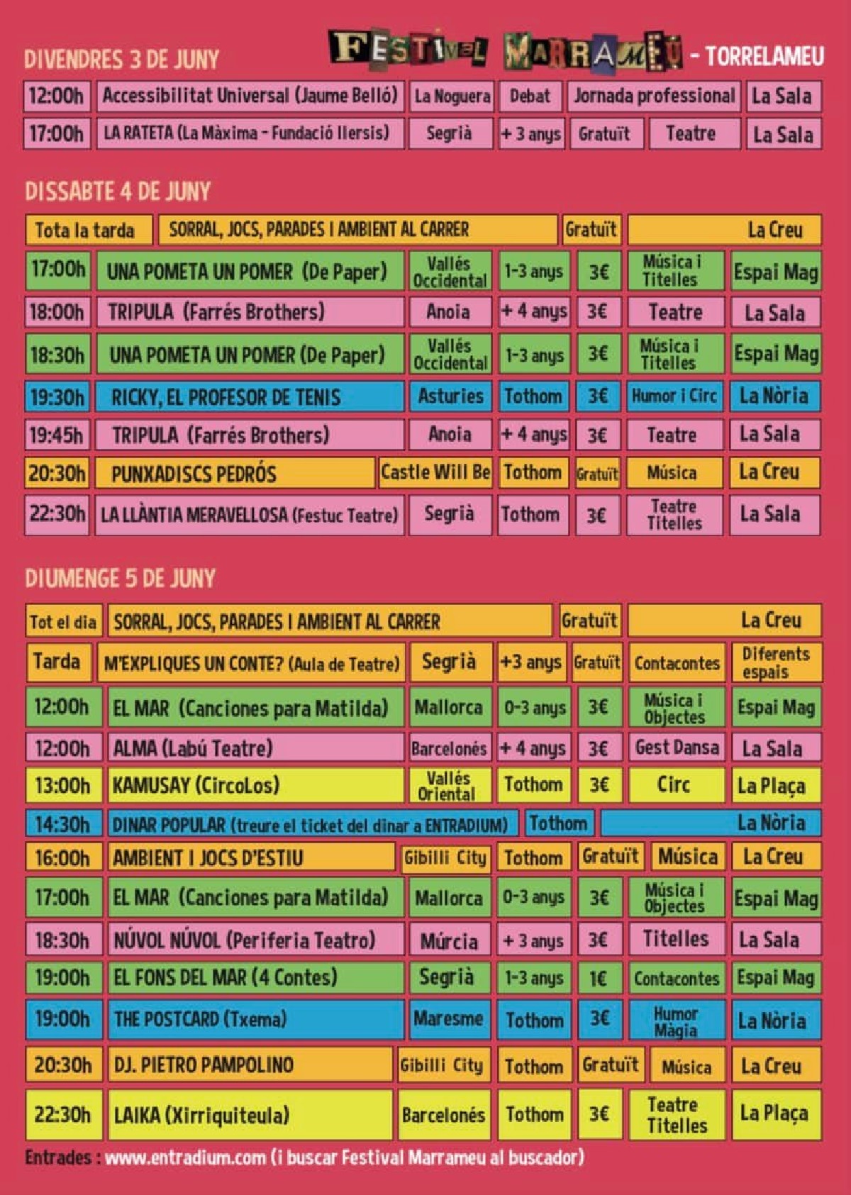 El 6è Festival de contes i espectacles de carrer Marrameu de Torrelameu ha obert la venda d'entrades aquest dilluns 16 de maig. Serà el cap de setmana del 3, 4 i 5 de juny i proposa fins a 17 espectacles i altres activitats paral·leles