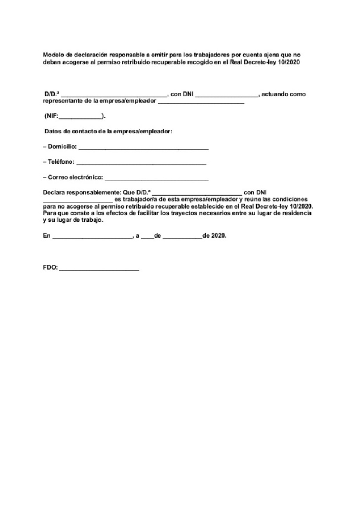 El Butlletí Oficial de l'Estat (BOE) ha publicat el model de declaració responsable que hauran de presentar els treballadors essencials en cas de ser reclamats per la policia i per evitar una sanció per incompliment del confinament fins al 9 d'abril. El govern va donar una moratòria d'un dia i a partir d'aquest dimarts el personal que vagi a treballar haurà de portar aquest certificat emès per la Moncloa. El document recull les dades de l'ocupador i de l'empresa de serveis essencials, que d'especificar el domicili, el telèfon i el correu electrònic i a més de detallar el DNI del treballador que porta el certificat. Amb aquesta declaració firmada per l'empresari, es permetrà que els treballadors puguin sortir de casa per anar a la feina.