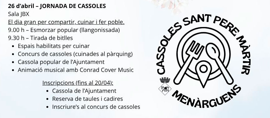 Menàrguens omple el cap de setmana d’activitats per celebrar Sant Pere Màrtir, en un programa en què destaca un concert el dissabte i la tradicional jornada de cassoles el diumenge