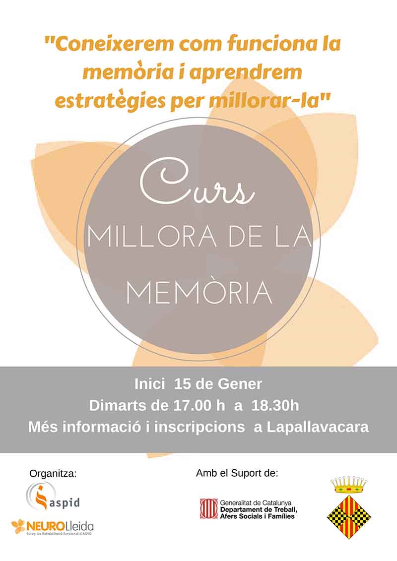 El Casal Lapallavacara acull aquest dimarts un curs de Millora de la Memòria adreçat a persones grans. És un curs gratuït i serà impartit per Aspid i NeuroLleida