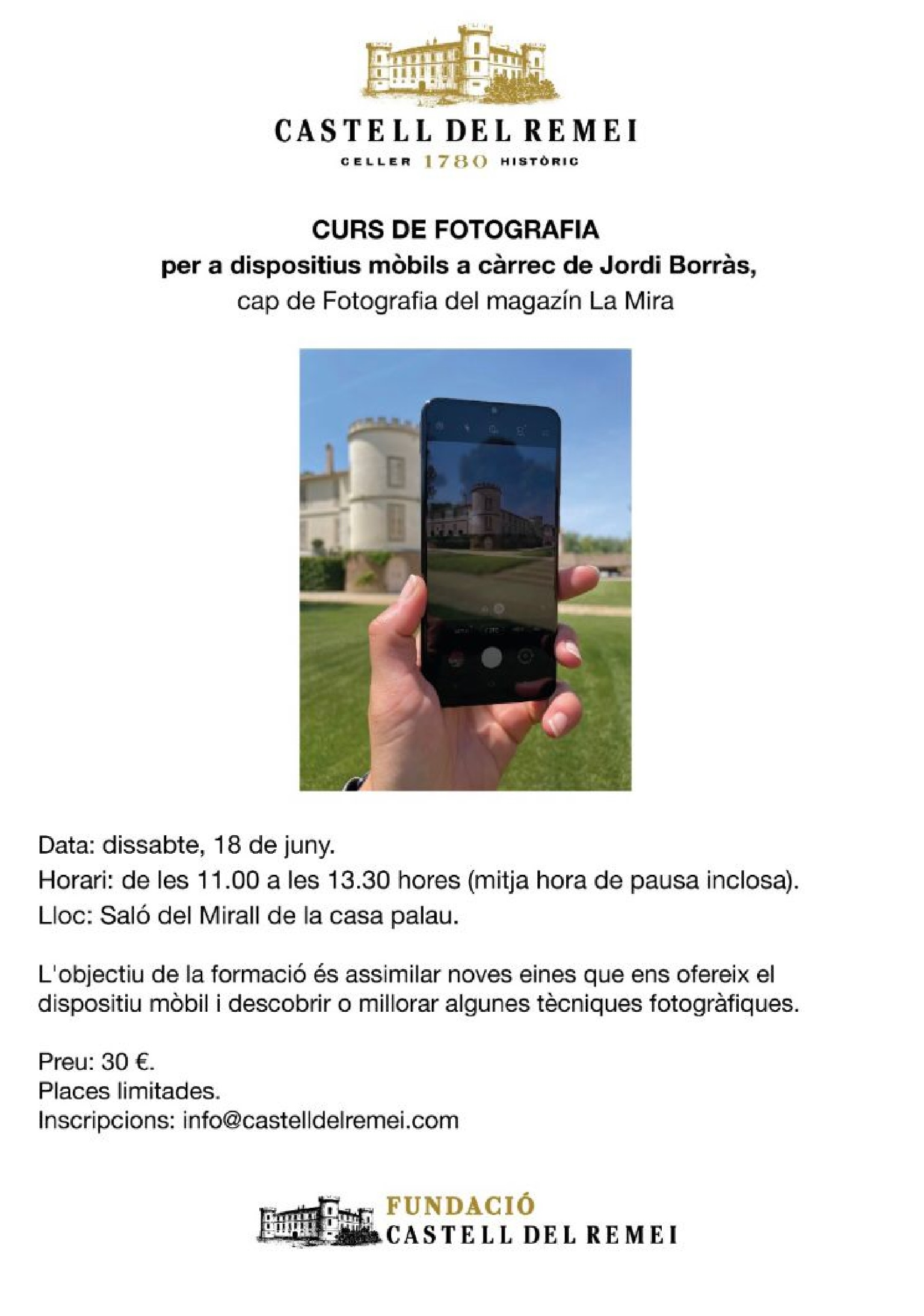 Així mateix, dissabte 18 de juny, el fotògraf Jordi Borràs, cap de fotografia del magazín La Mira, impartirà un Curs de Fotografia per a Dispositius Mòbils. L'horari serà de les 11.00 a les 13.30 hores, amb mitja hora de pausa inclosa, i tindrà lloc al Saló del Mirall de la casa palau. El preu és de 30 euros.
