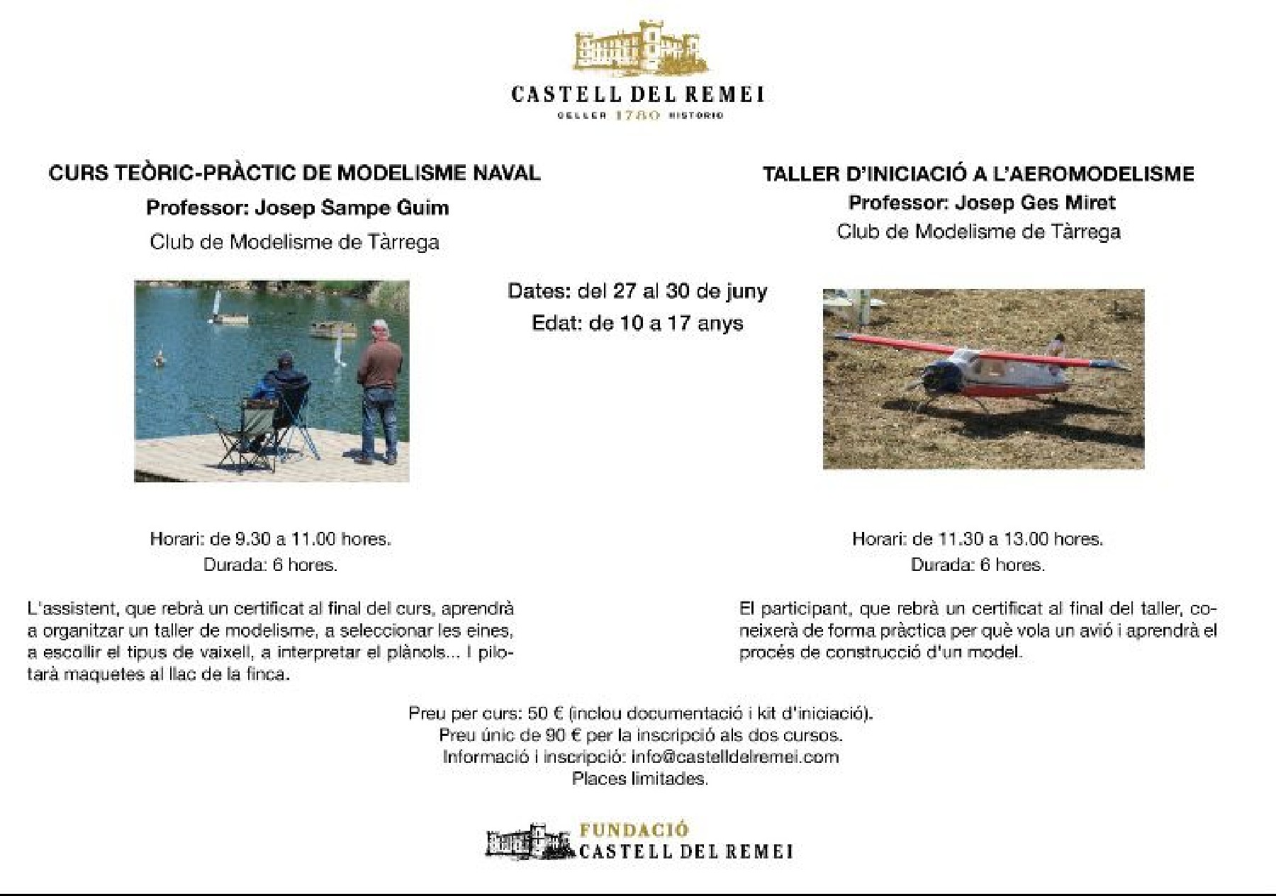 D'altra banda, els dies 27, 28, 29 i 30 de juny, la finca acollirà sengles cursos de sis hores de modelisme. De les 9.30 a 11.00 hores, Josep Sampe Guim, del Club de Modelisme de Tàrrega, impartirà un Curs teòric-pràctic de Modelisme Naval. I de les 11.30 a 13.00 hores, Josep Ges Miret, també membre del Club de Modelisme de Tàrrega, un Taller d'iniciació a l'Aeromodelisme. En ambdós casos, està dirigit a joves entre 10 i 17 anys i el preu és de 50 euros cadascun, atès que inclou material com un kit de muntatge, a no ser que es vulguin fer els dos que, aleshores, és de 90 €.
