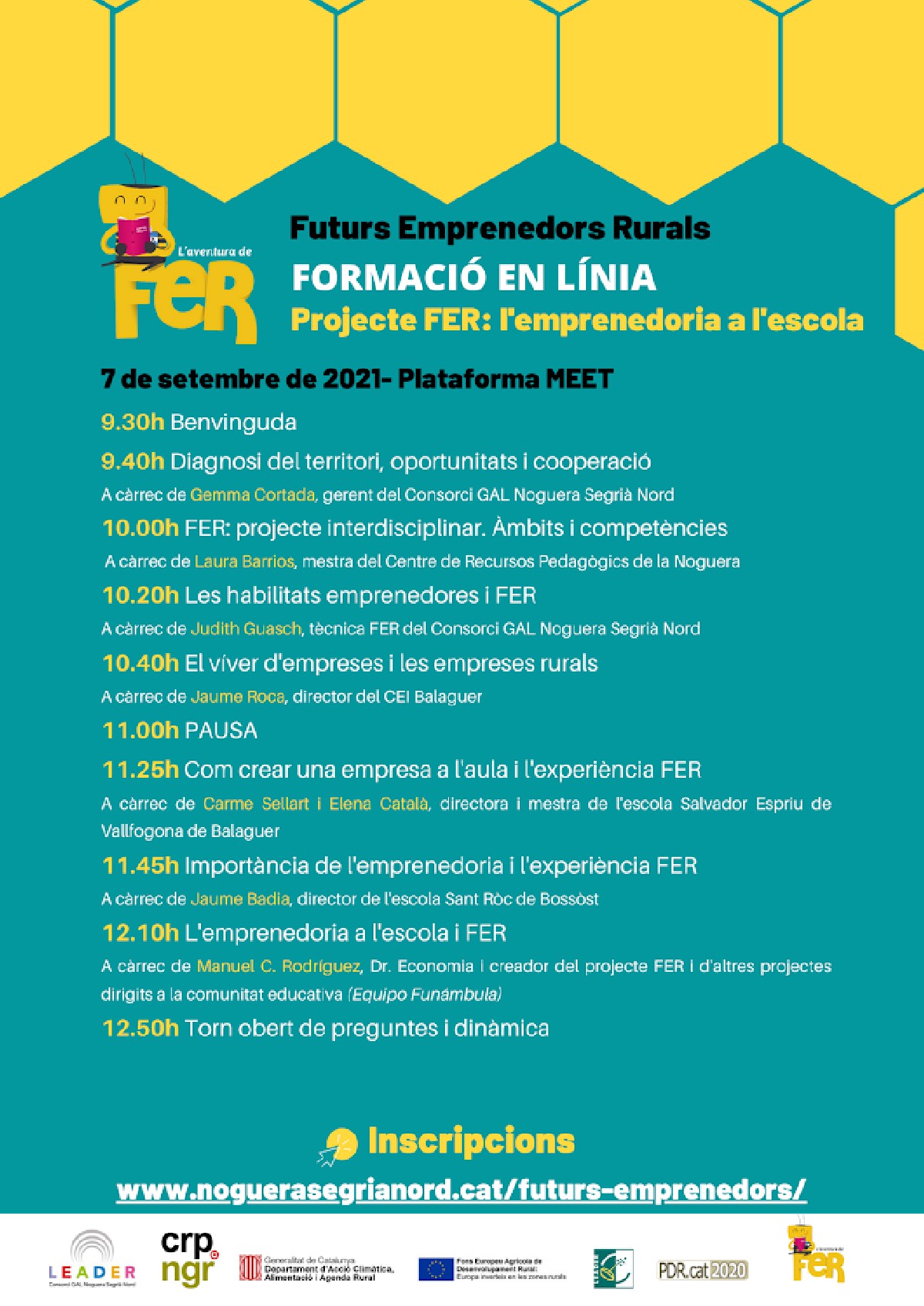 El Centre de Recursos Pedagògics de la Noguera i el Consorci GAL Noguera Segrià Nord han organitzat un Taller de Formació en línia que es dividirà en diverses sessions durant tot el curs escolar per tal de compartir experiències i oferir suport en relació amb l'emprenedoria i el projecte FER.