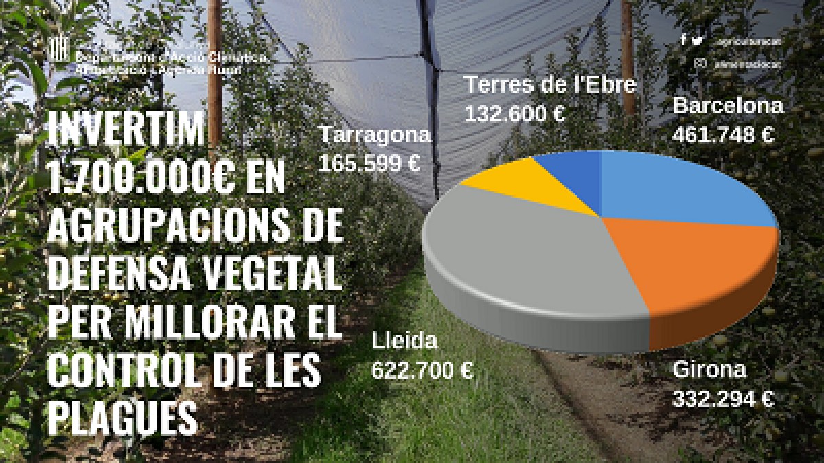 El Departament d'Acció Climàtica, Alimentació i Agenda Rural de la Generalitat ha fet un pagament de 1,7 milions d'euros (MEUR) repartits entre 99 Agrupacions de Defensa Vegetal (ADV) per a la prestació de serveis d'assessorament tècnic per prevenir o lluitar contra plagues, malalties i males herbes. D'aquesta forma, el Govern vol apostar per el foment de sistemes de lluita alternatius en matèria de sanitat vegetal. Paral·lelament, aquest abril també es va publicar la concessió de 1,9 MEUR de subvenció per a actuacions que s'estan realitzant durant aquest 2021 amb un increment de 100.000 euros respecte la convocatòria de l'any passat.