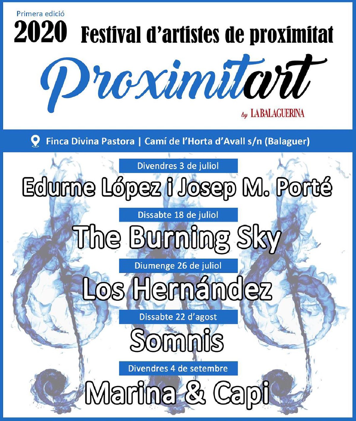 El festival Proximitart de Balaguer @ciutatbalaguer omple en la seva estrena a la Finca Divina Pastora i presenta el programa de concerts per l'estiu, amb The Burning Sky, Los Hernandez, Somis i Marina & Capi.