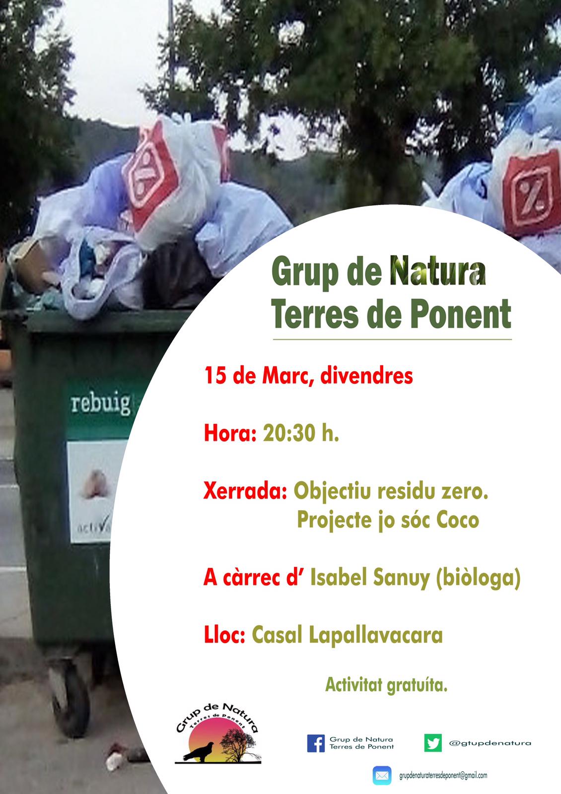 El Grup de Natura Terres de Ponent organitza una xerrada sobre residus aquest divendres 15 de març al casal Lapallavacara. La xerrada anirà a càrrec de la biòloga Isabel Sanuy