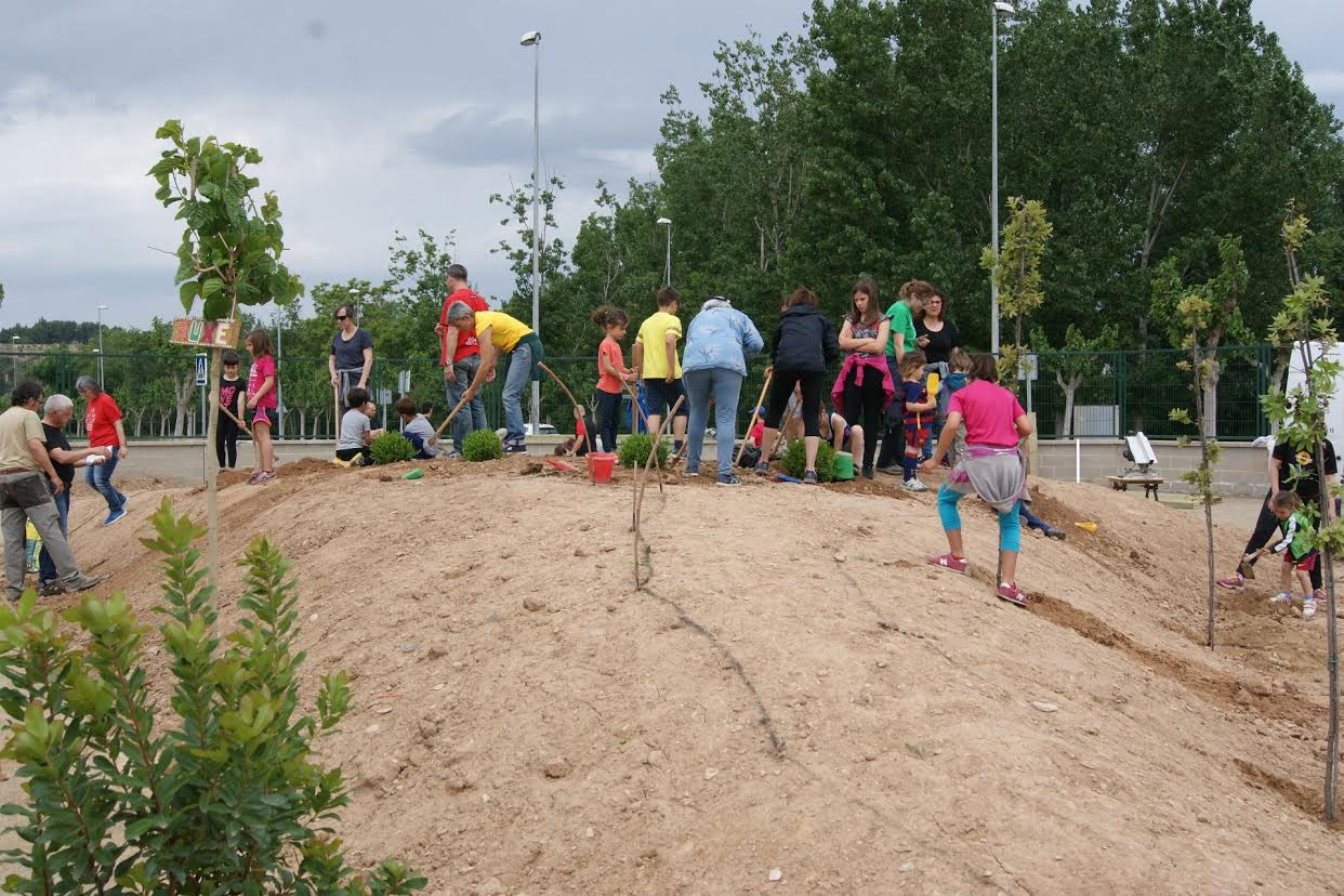 Més de 125 persones van col•laborar en la creació d'un escenari i d'un desnivell enjardinat, que permetrà als nens gaudir pujant, baixant i corrent servirà de grada per l'escenari.