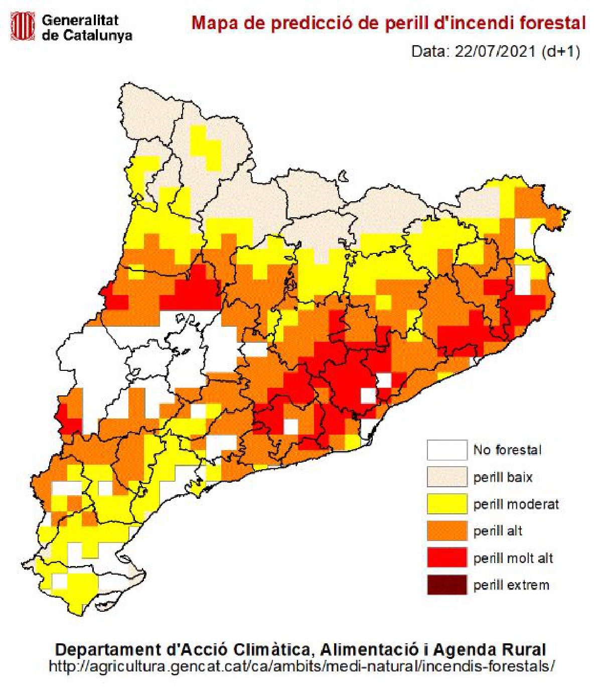 El perill d'incendi dels propers tres dies serà molt alt a tot Catalunya. 5 municipis de la Noguera: Artesa de Segre, La Baronia de Rialb, Oliola, Ponts, Tiurana i Vilanova de l'Aguda, al Pla Alfa de nivell 3 de risc d'incendi demà dijous