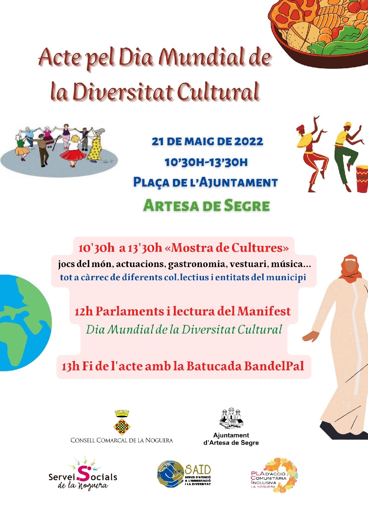 L'Ajuntament d'Artesa de Segre i l'àrea de Serveis Socials del Consell Comarcal de la Noguera, han organitzat una trobada de cultures amb motiu del Dia Mundial de la Diversitat Cultural. Sota el lema "Acte Mundial de la Diversitat Cultural", la trobada té l'objectiu de posar en valor totes les cultures que conviuen a Artesa de Segre.