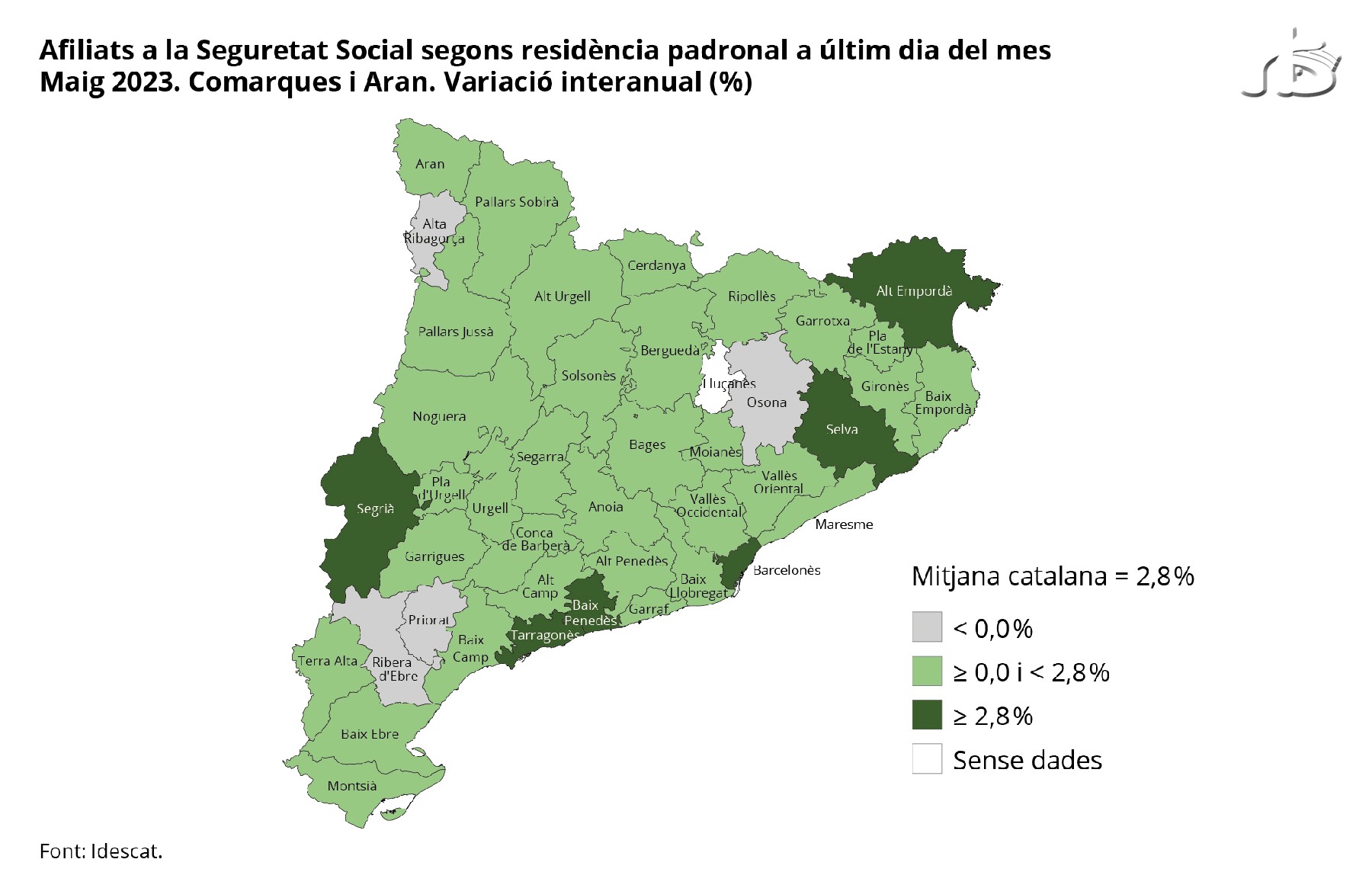 El Segrià, el Baix Penedès i el Barcelonès, les comarques on més pugen els afiliats al juny respecte fa un any. Al conjunt de Catalunya en el sisè mes de l'any es registra un increment interanual del 2,8%