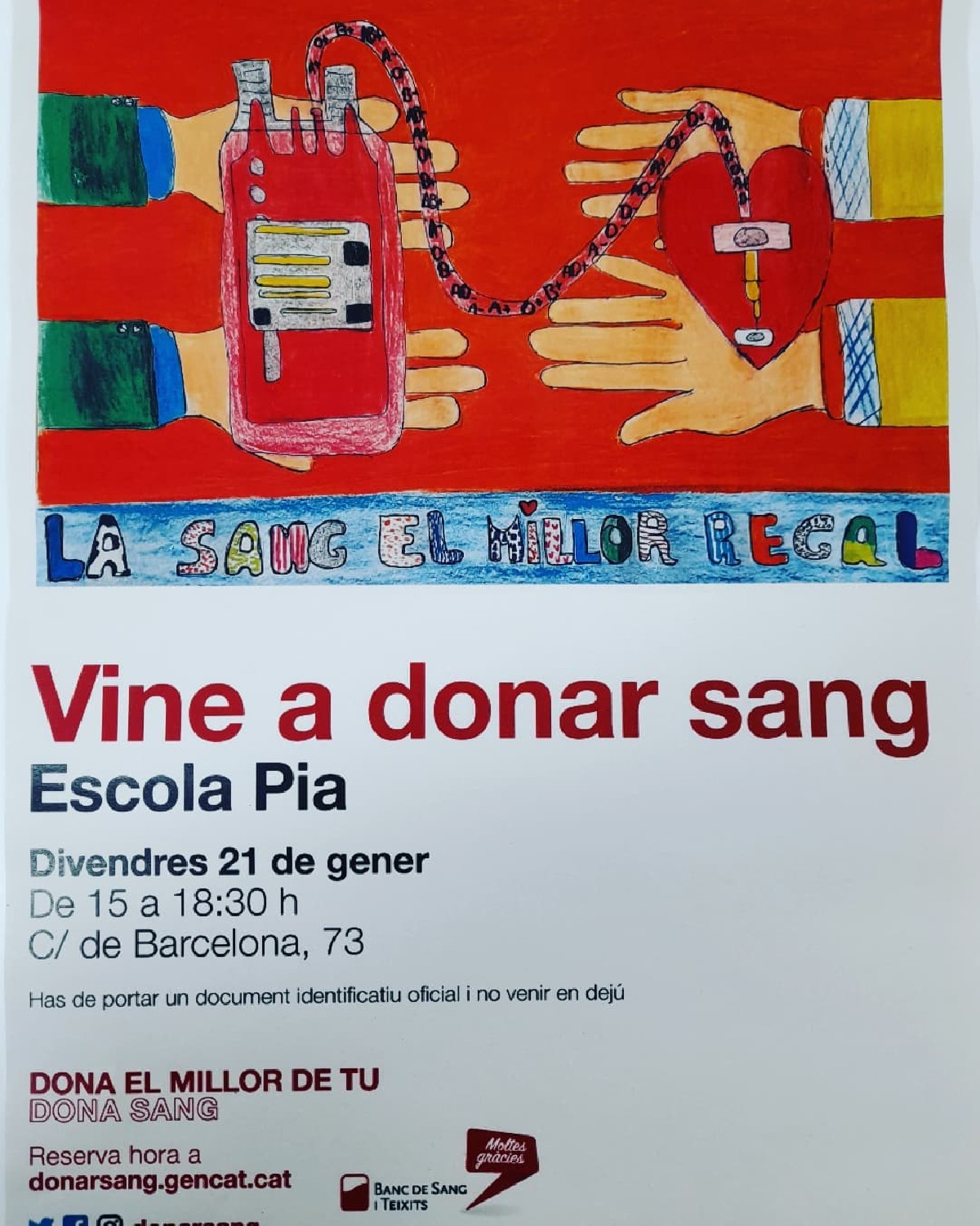 El proper divendres 21 de gener tindrà lloc una campanya de donació de sang a l'Escola Pia de Balaguer. Es tracta d'una activitat organitzada pels alumnes de 1r d'ESO i que realitzen per sisè any. Es fa amb una periodicitat anual, tot i que l'any passat no es va poder realitzar a causa de la pandèmia.