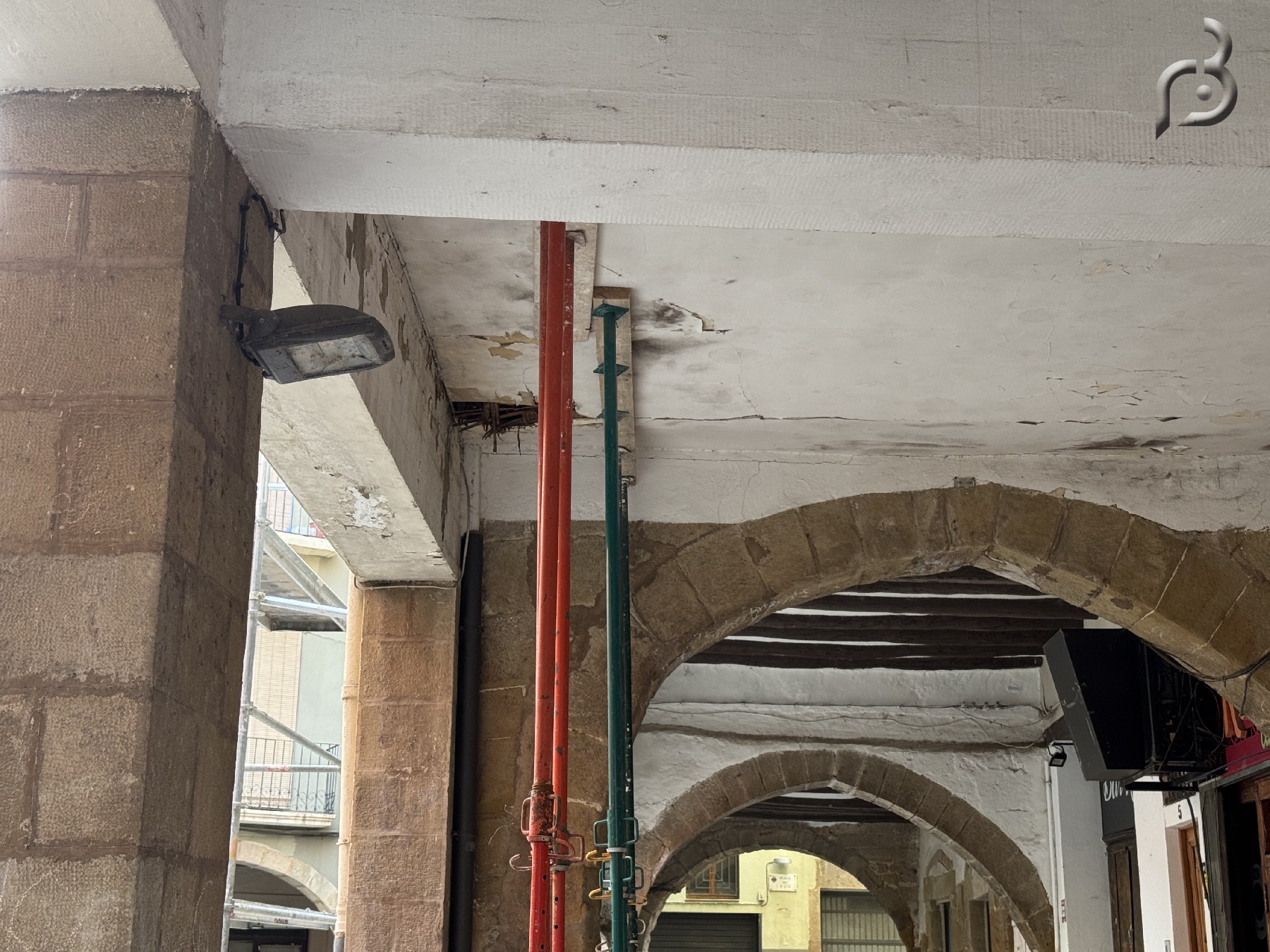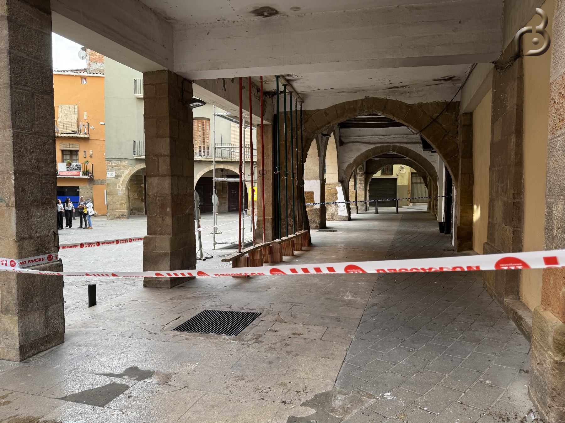 Els Bombers de la Generalitat van actuar dilluns al migdia a la plaça del Pou de Balaguer arran dels problemes estructurals detectats en un bloc deshabitat, situat al número 6. L'avís va arribar poc després de les tres de la tarda, quan uns operaris d'una obra propera van observar la caiguda de guix als porxos i van alertar que una biga havia quedat a la vista en mal estat.