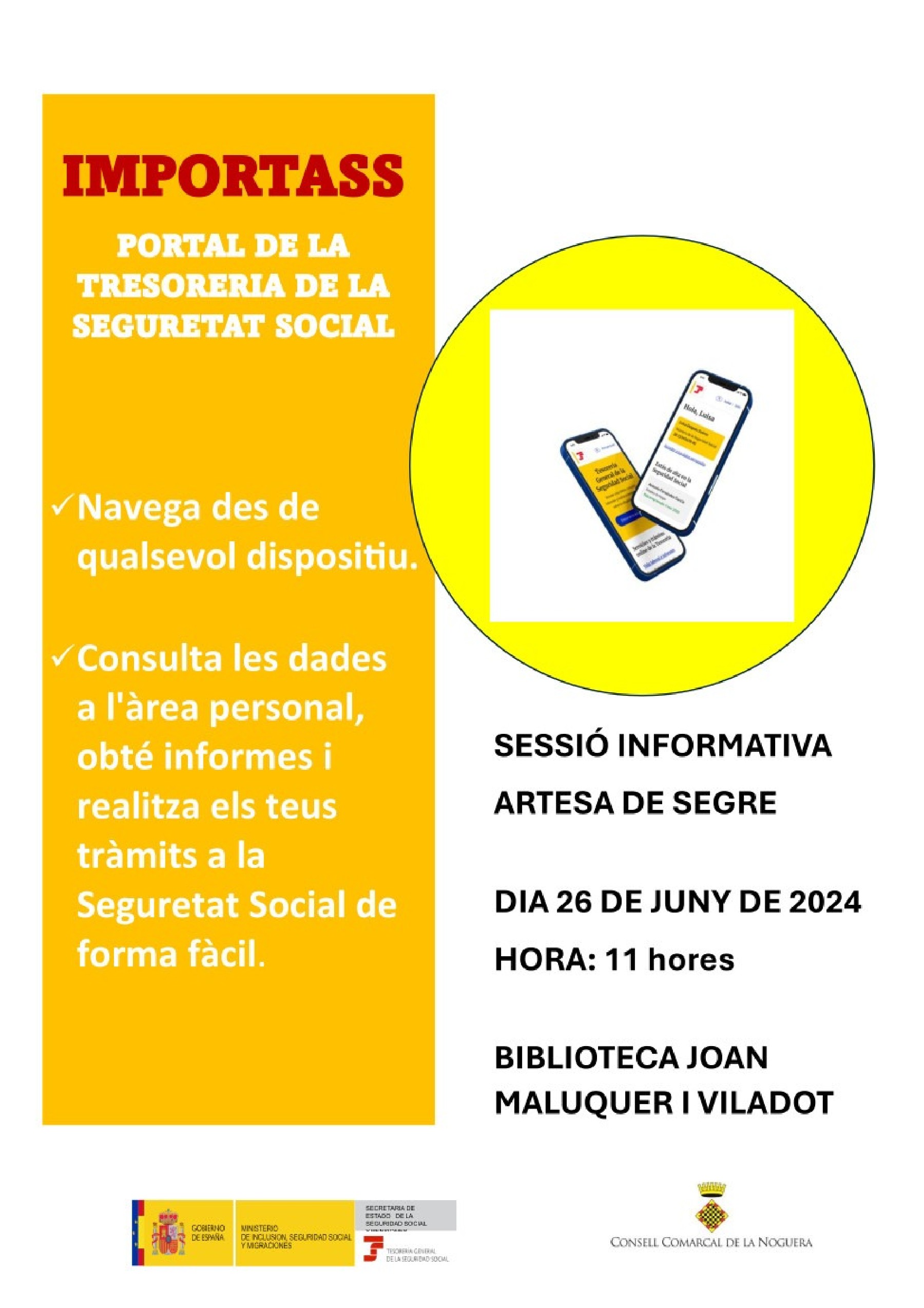 Els dies 26 de juny a Artesa de Segre i 27 de juny a Balaguer es realitzaran sessions informatives sobre l'ús de la plataforma electrònica IMPORTASS, que permet fer tràmits personals amb la Tresoreria de la Seguretat Social