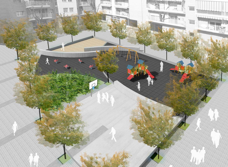 El nou plantejament passa per la creació de quatre àrees: un sorral per als infants més petits; una zona central de cautxú amb jocs infantils; un espai pels nens més grans amb una cistella de bàsquet o una taula de tennis taula i una àrea verda. Cada una d'aquestes àrees i tot l'entorn estarà delimitat per unes planxes de formigó, que al mateix temps també serviran de bancs.