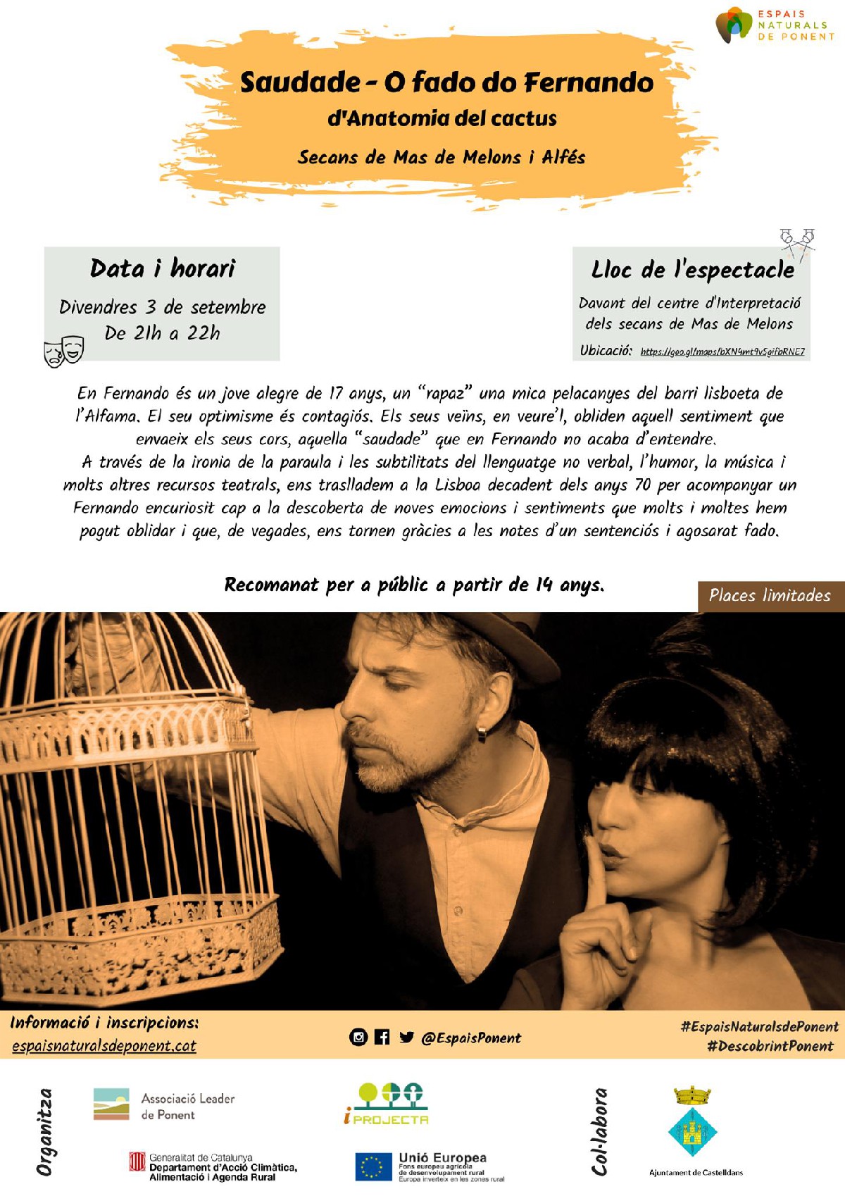 Espais Naturals Ponent reprenen la seva agenda d'activitats aquest divendres amb una cita davant del centre d'Interpretació dels secans de Mas de Melons. Serà amb l'espectacle 'Saudade (o fado de Fernando)' d'Anatomía del Cactus.