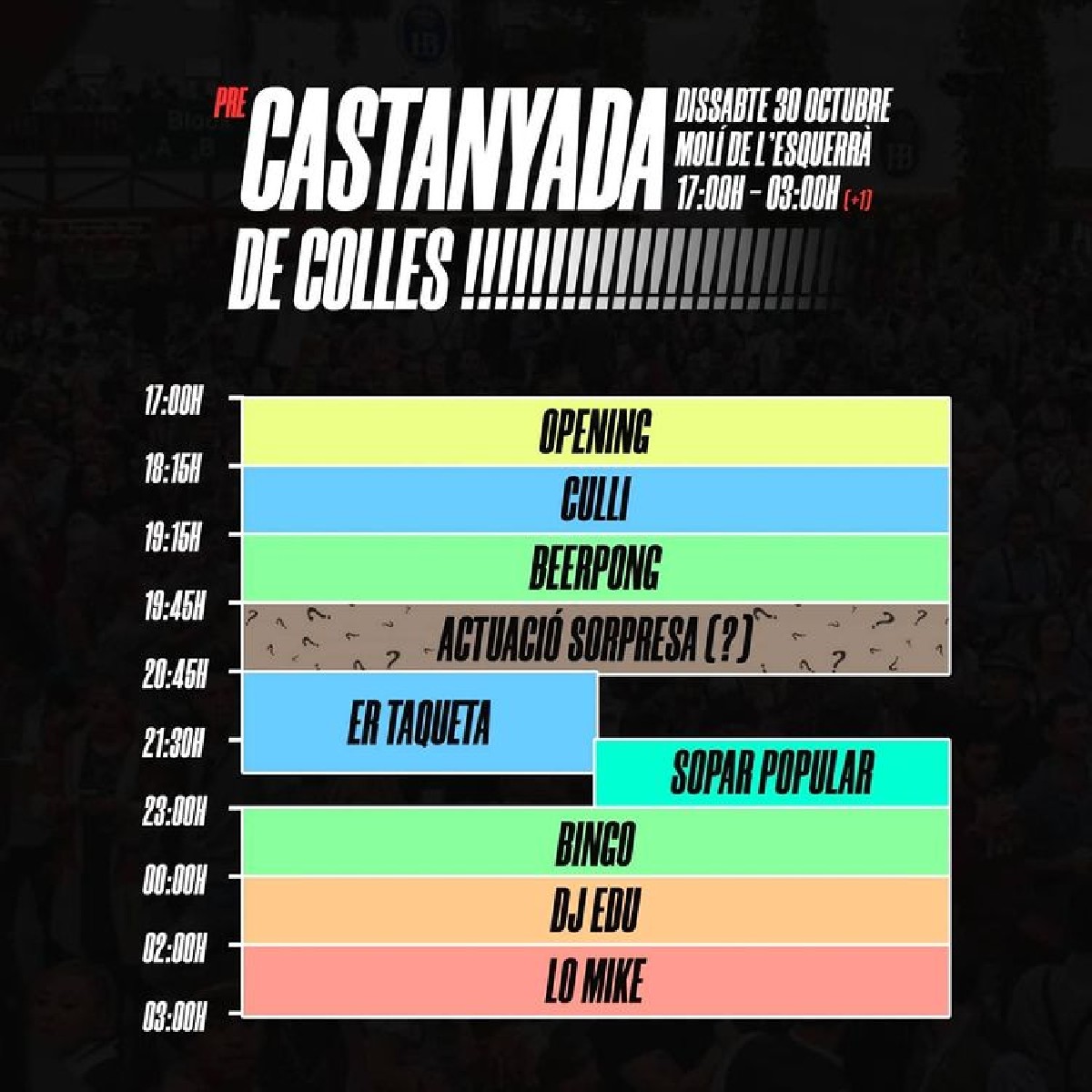 Les activitats de tarda començaran les 5. El cartell inclou activitats culturals i musicals, com un Beerpong i un Bingo. També es podrà gaudir dels concerts del balaguerí Culli i el lleidatà Er Taqueta. Seguidament es celebrarà el sopar i després hi haurà les actuacions dels Djs Edu i Lo Maik que finalitzaran a les 3 de la matinada.