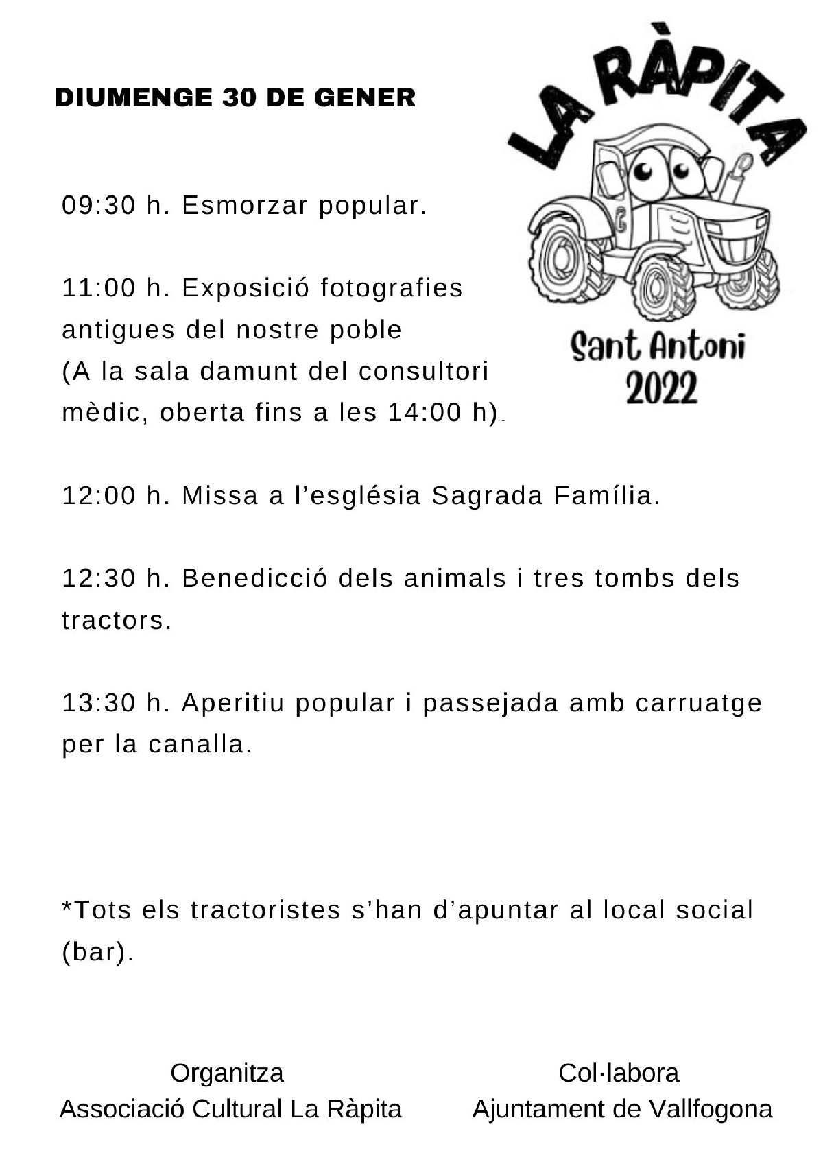 La benedicció dels animals de companyia o els tres tombs dels tractors s'iniciaran a 2/4 d'1, per acabar a 2/4 de 2 amb un aperitiu popular i passejada amb carruatge per als infants.