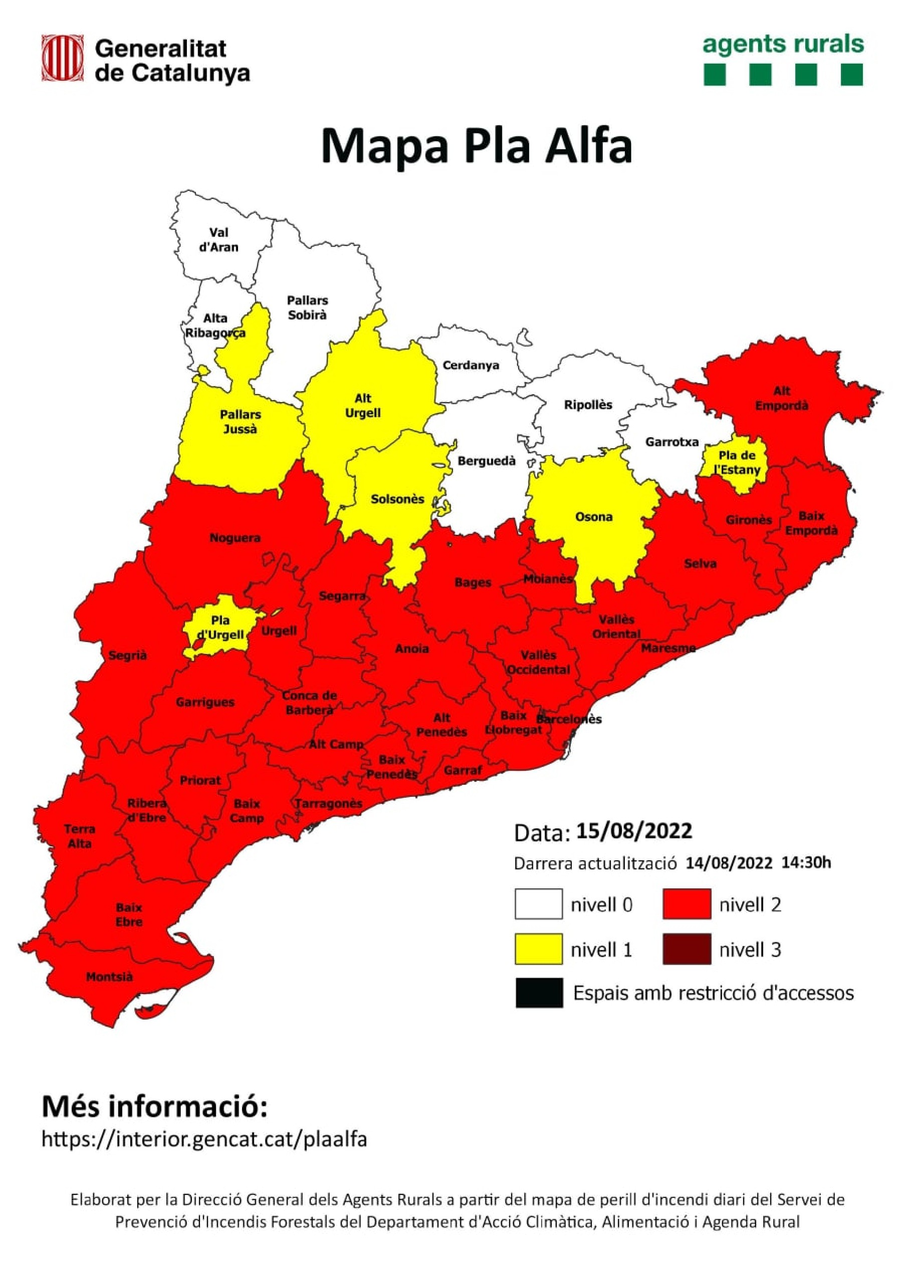 El Departament d'Interior desactivarà aquesta mitjanit el nivell 3 del pla Alfa de perill extrem d'incendi davant la previsió de la millora de les condicions meteorològiques. D'aquesta manera, decauran les restriccions que tenen aquest cap de setmana 249 municipis de 23 comarques de Catalunya i que impliquen que queden prohibides totes les activitats de risc d'incendi forestal, incloent els treballs al bosc i la caça. També estan tancats els accessos a vuit espais naturals. Les restriccions continuen aquest diumenge a la tarda, però a partir d'aquest dilluns es rebaixarà el pla al nivell 2 per risc alt o molt alt d'incendi a 29 comarques.
