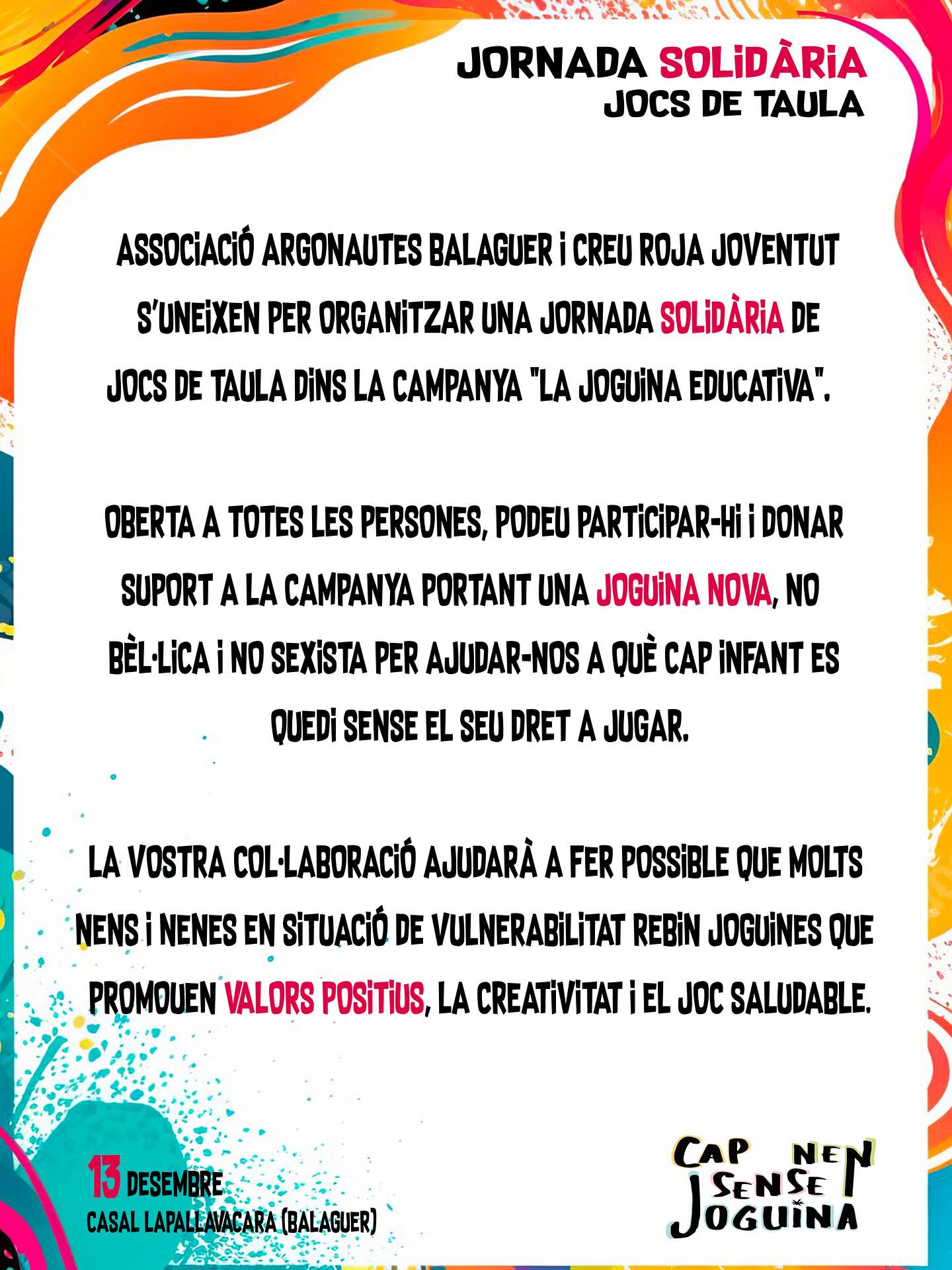 L’Associació Argonautes Balaguer i Creu Roja Joventut han unit esforços per impulsar una jornada solidària de jocs de taula en el marc de la campanya “La joguina educativa”. L’esdeveniment tindrà lloc el dissabte 13 de desembre al Casal Lapallavacara de Balaguer, en horari de 10 a 14 h al matí i de 17 a 21 h a la tarda.