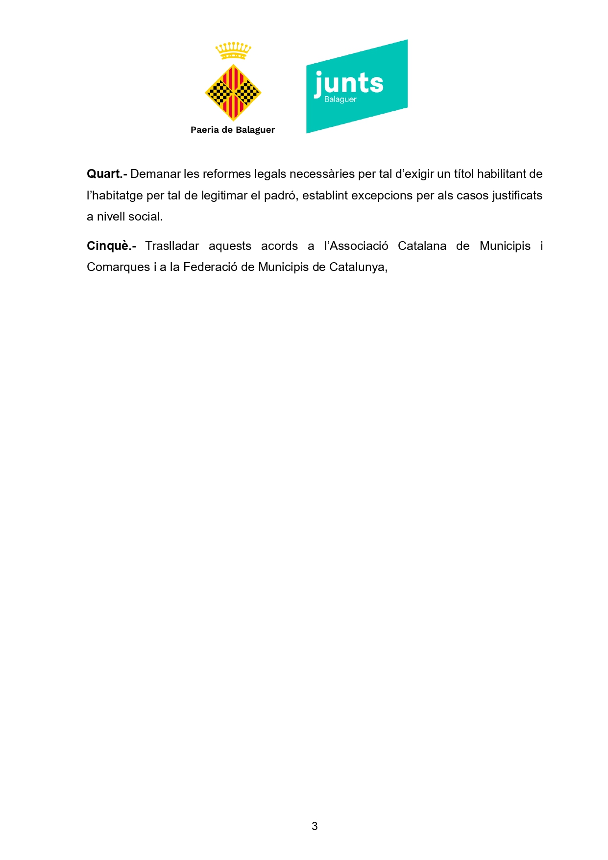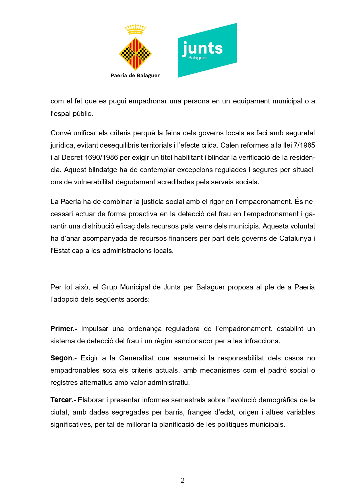 Per tot això, el Grup Municipal de Junts per Balaguer proposa que la Paeria impulsi una ordenança reguladora de l’empadronament, que estableixi un sistema de detecció del frau i un règim sancionador per a les infraccions. Així mateix, demana que la Generalitat assumeixi els casos no empadronables segons els criteris actuals i que s’exigeixi un títol habilitant de l’habitatge per legitimar el padró.