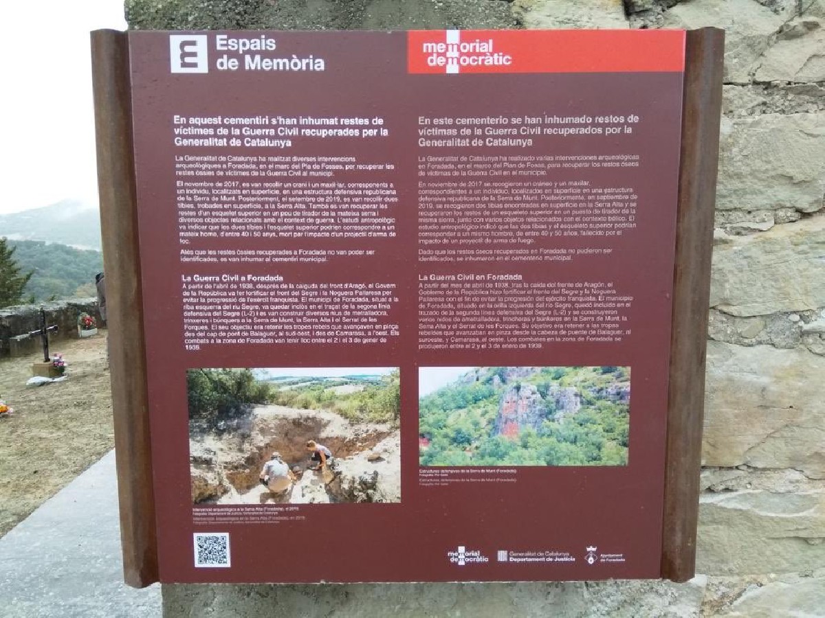 Justícia retorna les restes de dos soldats republicans a Foradada. El Departament ha instal·lat una placa al cementiri municipal. Les persones sense identificar s'enterren als municipis on van ser trobades