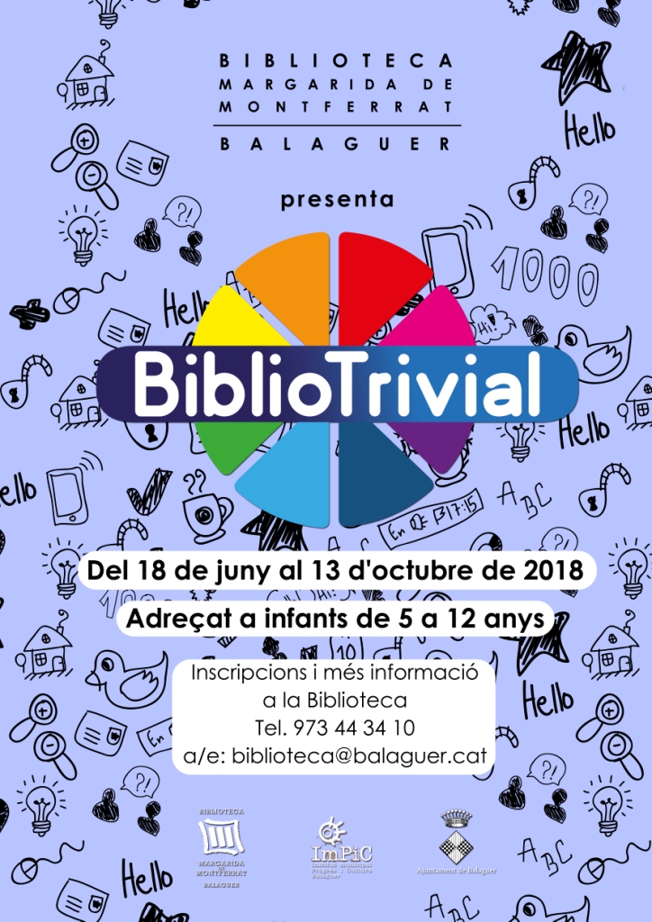 El dilluns dia 18 de juny a les 5 de la tarda es donarà el tret de sortida als participants del 1r Bibliotrivial. Es tracta d'una activitat de foment de la lectura adreçada a infants d'entre 5 i 12 anys, o lectors de llibres adreçats a aquestes edats, classificats en tres categories diferents: de 5 a 6 anys, de 7 a 9 anys i de 10 a 12 anys.