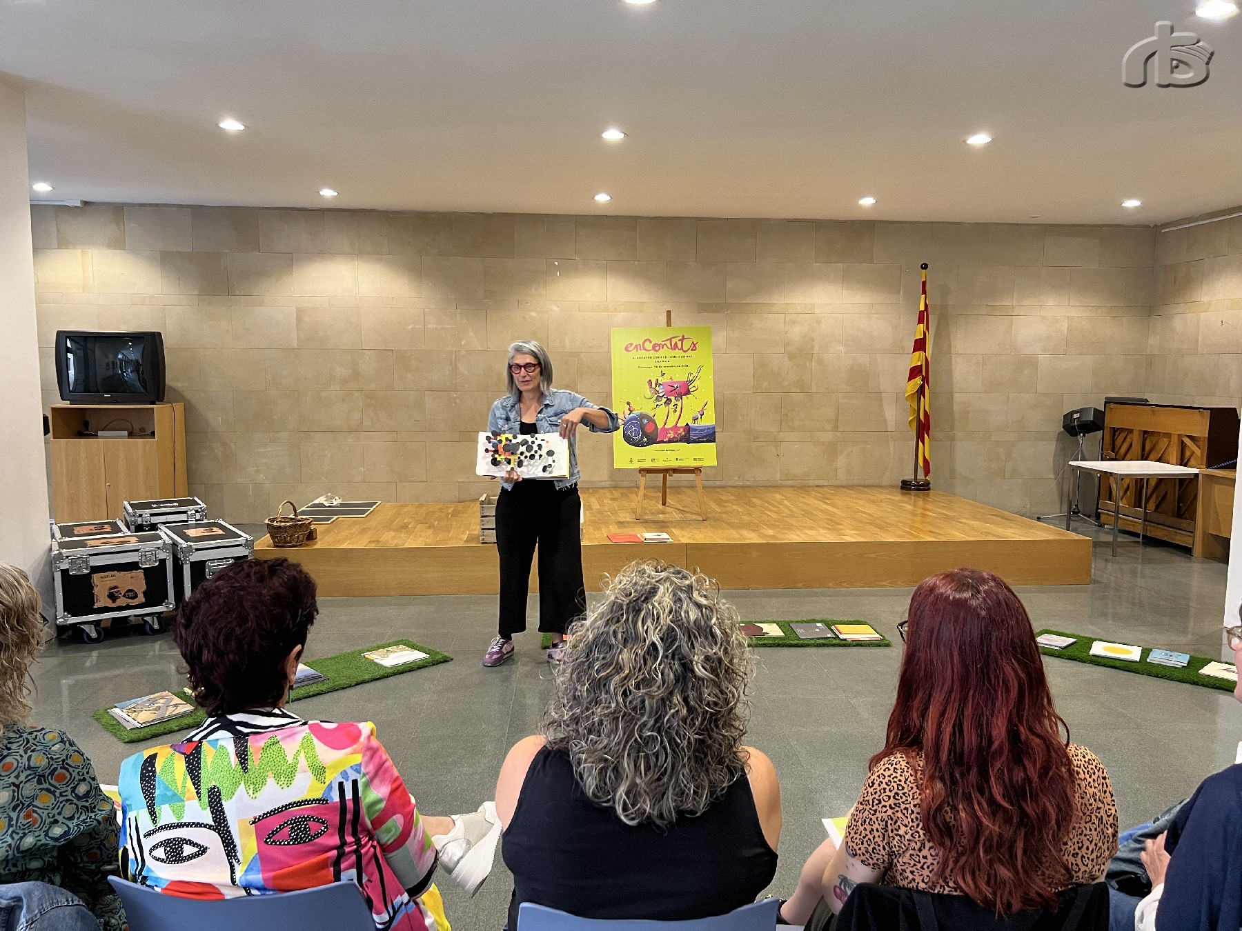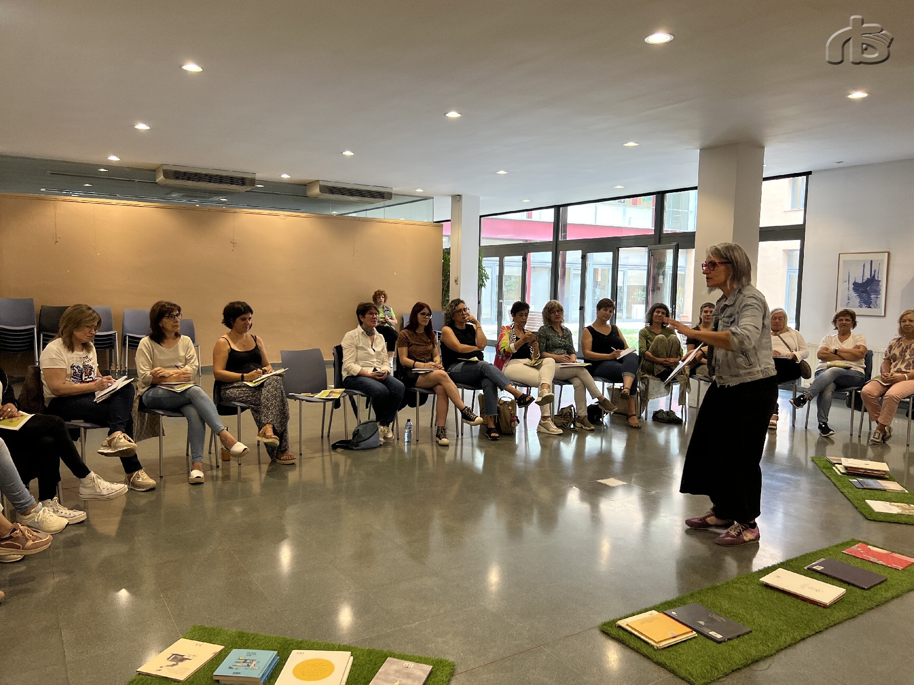 Hi participen una vintena de professionals de Lleida que assisteixen a la xerrada Qui parla i qui mira? El com i l'estona de l'àlbum il·lustrat a càrrec de la narradora oral Mon Mas, especialista en àlbum il·lustrat.