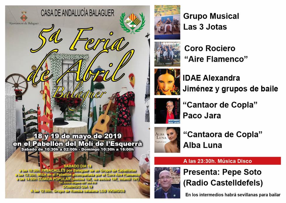 La Casa d'Andalusia de Balaguer organitza la 5a 'Feria de Abril' a Balaguer. Serà aquest proper cap de setmana 18 i 19 de maig al pavelló Molí de l'Esquerrà
