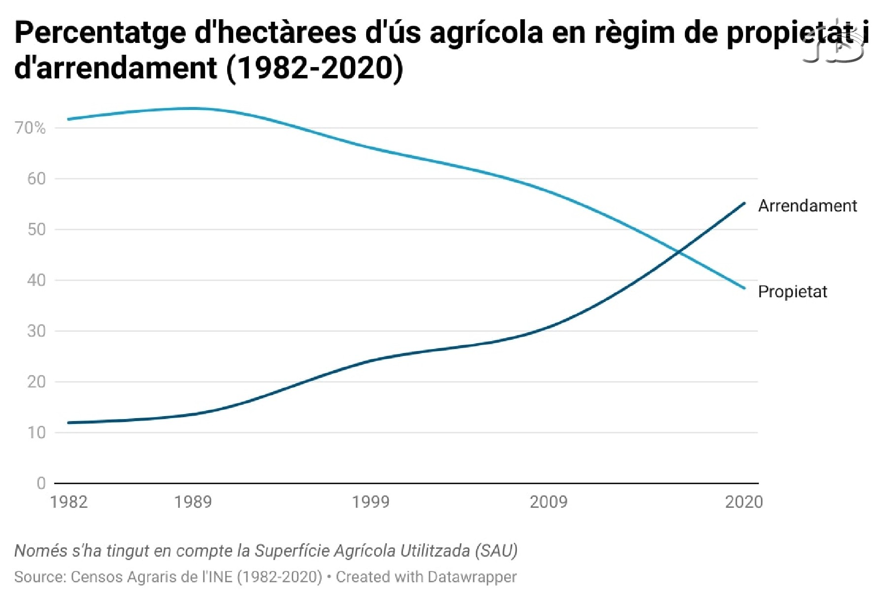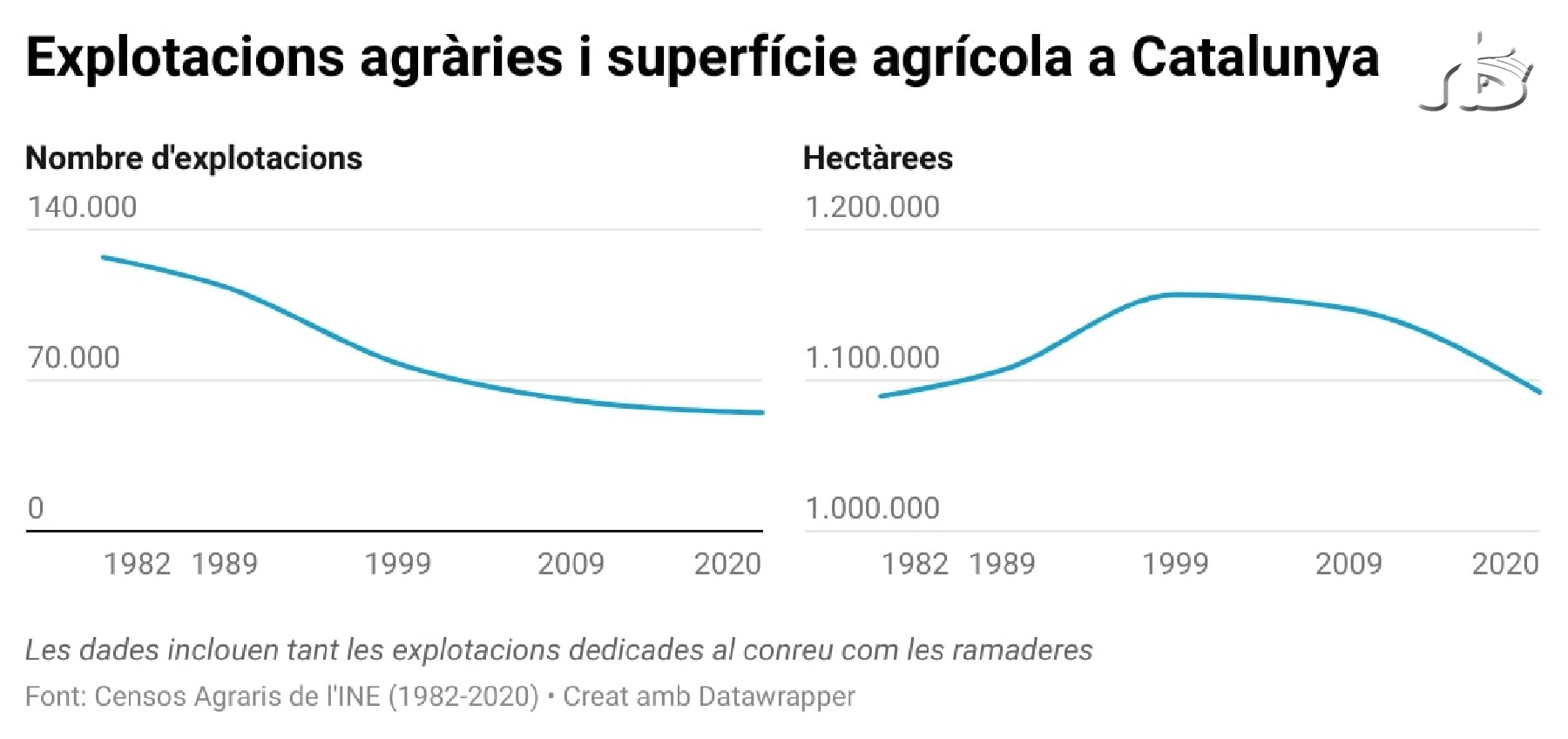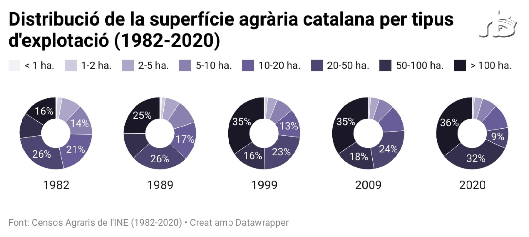La concentració progressiva del sector agrari a Catalunya ha reduït a més de la meitat les propietats que hi havia fa 40 anys. Segons el darrer cens agrari de l'INE disponible (2020), s'ha passat de 127.285 unitats el 1982 a 54.972 instal·lacions agrícoles i ramaderes, un 10% de les quals han desaparegut durant l'última dècada. Repartida en menys mans, el 36% de la terra cultivada es concentra en el 3,5% de les explotacions, que tenen 100 hectàrees o més d'extensió. Tot i així, l'explotació més habitual segueix sent la petita (2 a 5 hectàrees) i més de la meitat no arriben a les 10 ha. D'altra banda, l'arrendament ja és el règim majoritari de tinença de la terra, amb un 55%, mentre la propietat ha caigut del 70% al 38% de les explotacions.