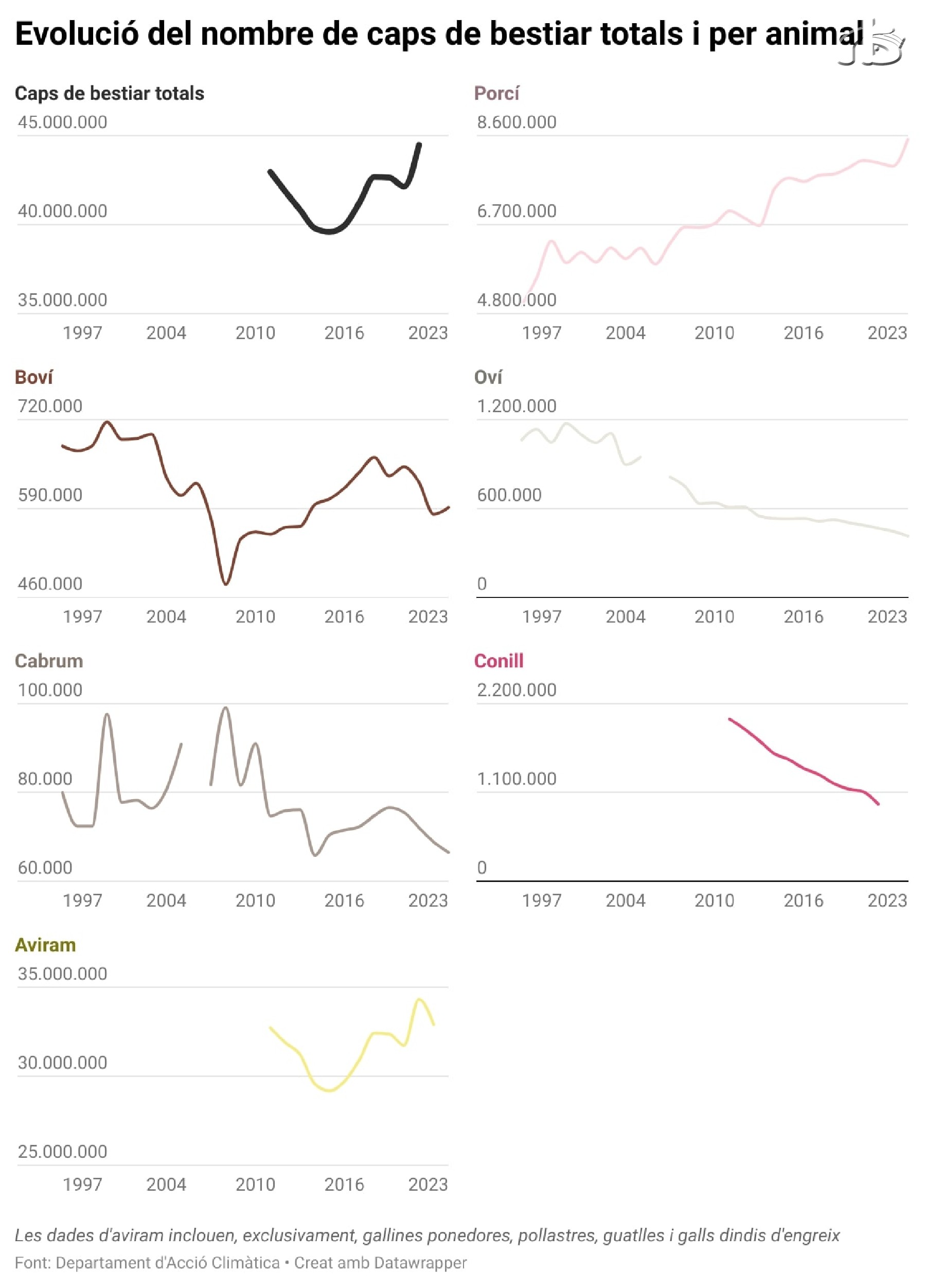 Els conills que es troben a les explotacions catalanes són poc menys d'un milió, amb dades del 2021, una tendència que no para de baixar, com a mínim des dels dos milions que es van registrar l'any 2011. Els bous i vaques censats arreu del país es queden a les portes dels 600.000, uns 100.000 menys que les xifres del tombant de segle passat, i les ovelles també estan esvaint-se dels camps catalans: al voltant de l'any 2000 n'hi havia més d'un milió, mentre que el 2023 se n'havien censat 413.538. La caiguda del nombre de cabres no és tan pronunciada, passant de les prop de 80.000 el 1997 a les 66.522 el 2023.