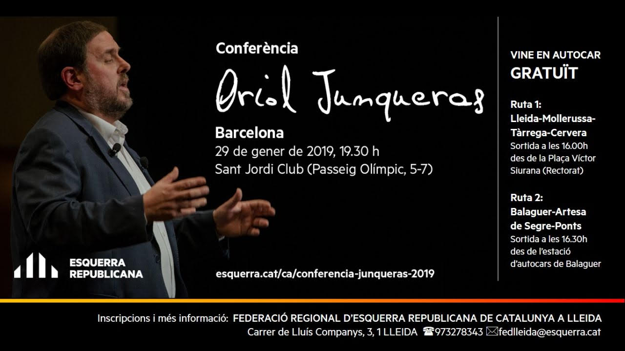 La Federació de Lleida d'Esquerra Republicana organitza autocars gratuïts per assistir a la 'Conferència Oriol Junqueras' d'aquest dimarts al Sant Jordi Club de Barcelona. El de Balaguer sortirà a 2/4 de 5 de la tarda i s'aturarà a Artesa de Segre i Ponts