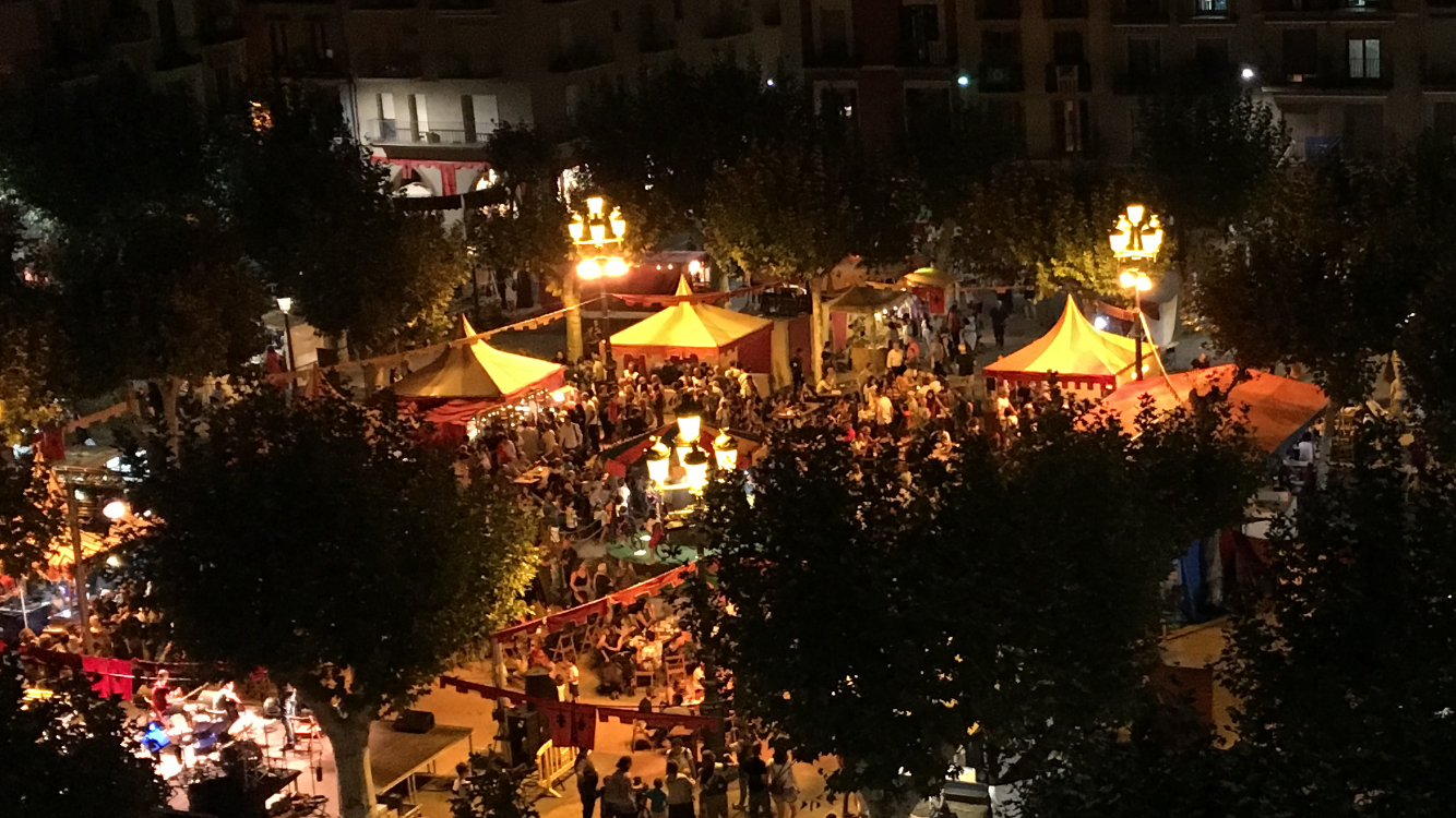 L'Harpia 2018 en guany ha tornat a comptar amb un gran mercat medieval al Centre Històric, amb unes 120 parades, distribuïdes entre els diferents carrers que el configuren. En l'edició d'enguanu destaca el fet que el tradicional sopar medieval s'ha substituït per un espai gastronòmic anomenat "Les Tavernes" on poder menjar alguna cosa, de fet ahir dissabte al vespre l'afluència de públic en aquest espai va ser tanta, que va ser difícil trobar lloc on seure. La nit va ser a més amenitzada amb les actuacions musicals de FAR i dels Cronistes, amb música folk.